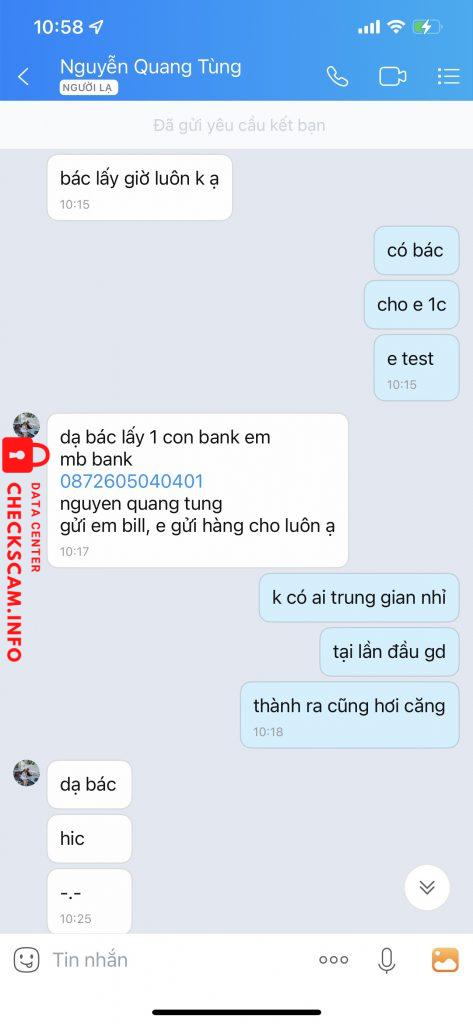 Cảnh báo kẻ lừa đảo: Nguyen Quang Tung Đã báo cáo: November 16, 2024 Thông tin kẻ lừa đảo Họ và tên: Nguyen Quang Tung Cổng thanh toán: Mbbank Tài khoản thanh toán: 0872605040401 Danh mục: Lừa đảo mua bán Nguồn: Checkscam Tệp bằng chứng Mô tả báo cáo Lừa mua tài khoản 5m8 bank xong mất hình Bình luận Bình luận của bạn Thêm bình luận Chưa có bình luận nào. Hãy là người đầu tiên chia sẻ kinh nghiệm của bạn với kẻ lừa đảo này.