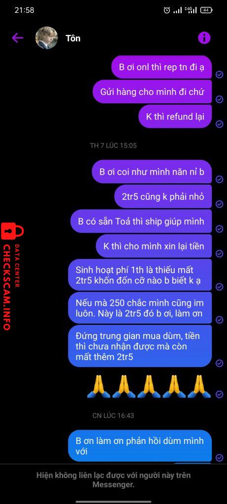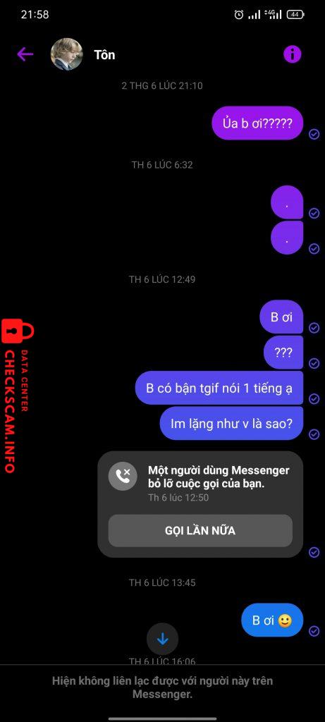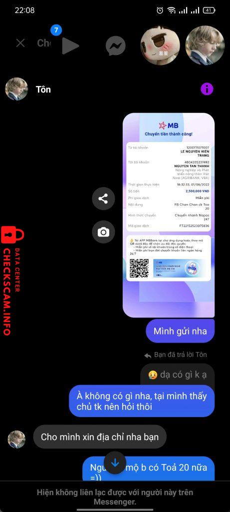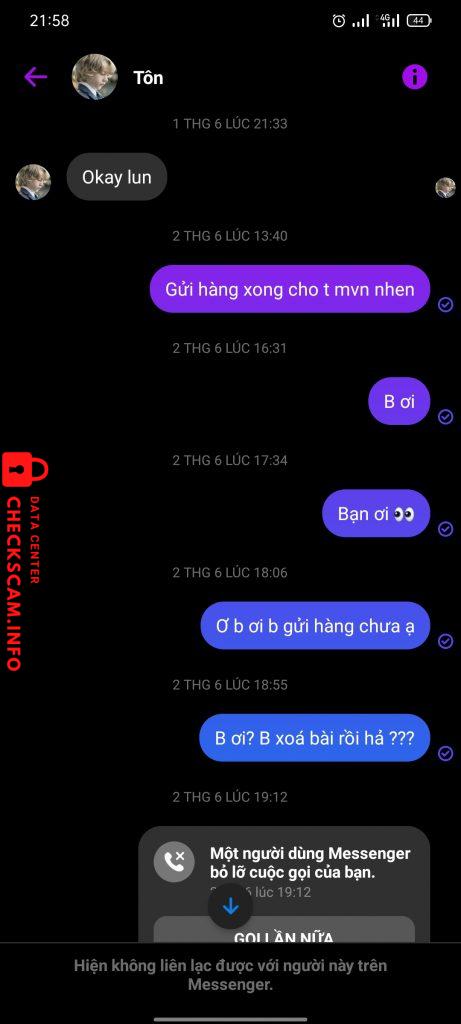 Cảnh báo kẻ lừa đảo: NGUYEN TAN THANH Đã báo cáo: November 16, 2024 Thông tin kẻ lừa đảo Họ và tên: NGUYEN TAN THANH Cổng thanh toán: Agribank Tài khoản thanh toán: 4804205237492 Danh mục: Lừa đảo mua bán Nguồn: Checkscam Tệp bằng chứng Mô tả báo cáo Lừa đảo bán hàng, sau khi nhận tiền thì off rồi block fb Bình luận Bình luận của bạn Thêm bình luận Chưa có bình luận nào. Hãy là người đầu tiên chia sẻ kinh nghiệm của bạn với kẻ lừa đảo này.