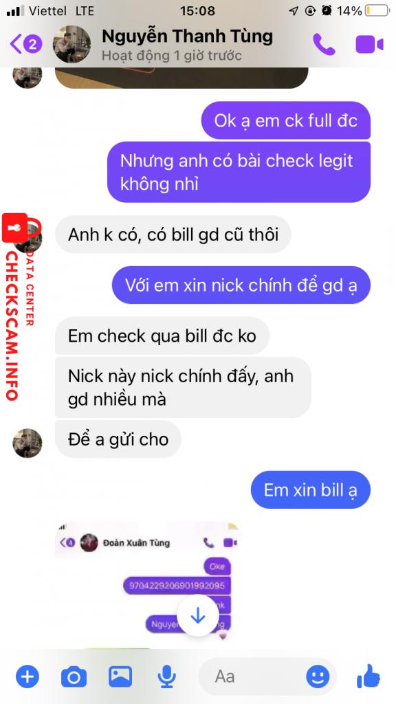 Cảnh báo kẻ lừa đảo: Nguyễn thanh tùng Đã báo cáo: November 16, 2024 Thông tin kẻ lừa đảo Họ và tên: Nguyễn thanh tùng Cổng thanh toán: MB bank Tài khoản thanh toán: 9704229206901992095 Danh mục: Lừa đảo mua bán Nguồn: Checkscam Tệp bằng chứng Mô tả báo cáo Scam rất nhiều bạn mn né xa và có thể public thông tin để mn tránh ạ Bình luận Bình luận của bạn Thêm bình luận Chưa có bình luận nào. Hãy là người đầu tiên chia sẻ kinh nghiệm của bạn với kẻ lừa đảo này.