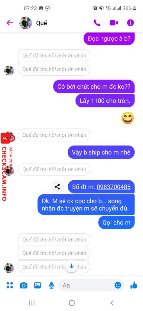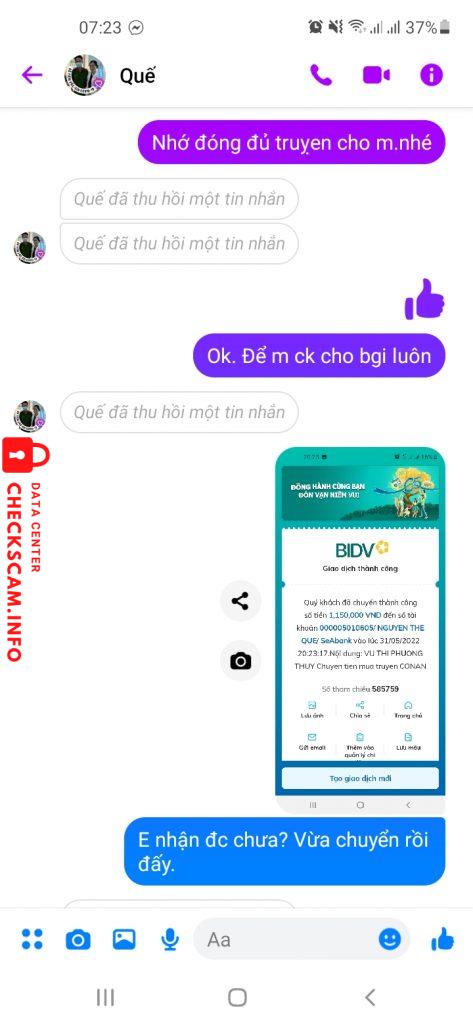 Cảnh báo kẻ lừa đảo: NGUYEN THE QUE Đã báo cáo: November 16, 2024 Thông tin kẻ lừa đảo Họ và tên: NGUYEN THE QUE Cổng thanh toán: SeAbank Tài khoản thanh toán: 000005010605 Danh mục: Lừa đảo mua bán Nguồn: Checkscam Tệp bằng chứng Mô tả báo cáo Nguyễn Thế Quế lừa bán truyện tranh.. Bình luận Bình luận của bạn Thêm bình luận Chưa có bình luận nào. Hãy là người đầu tiên chia sẻ kinh nghiệm của bạn với kẻ lừa đảo này.