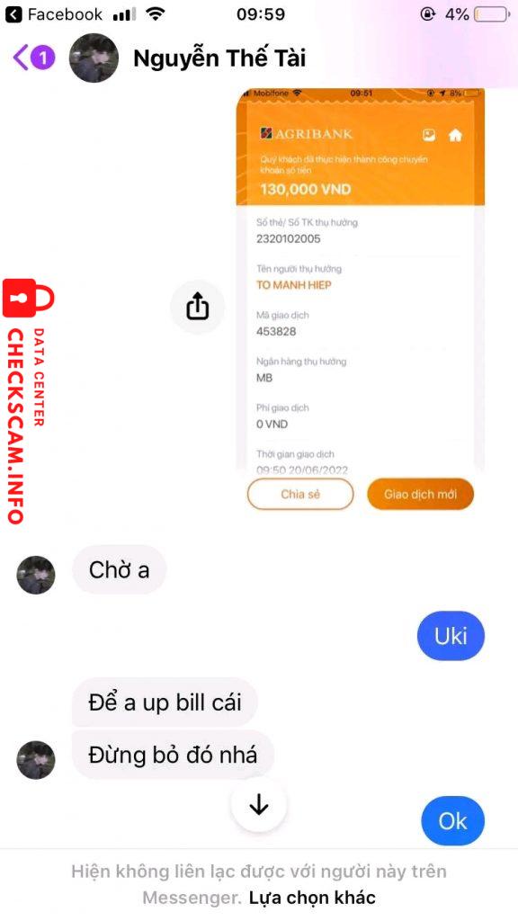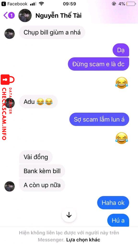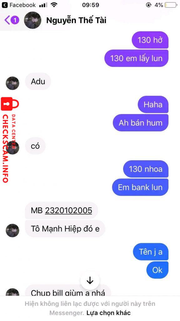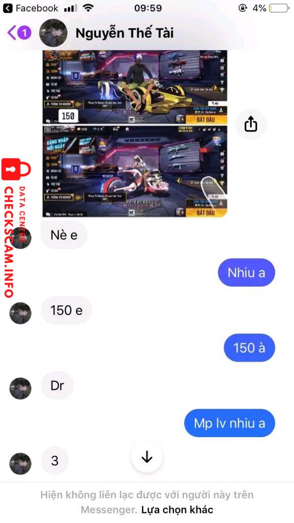 Cảnh báo kẻ lừa đảo: Nguyễn Thế Tài Đã báo cáo: November 16, 2024 Thông tin kẻ lừa đảo Họ và tên: Nguyễn Thế Tài Cổng thanh toán: Mb Bank Tài khoản thanh toán: 2320102005 Danh mục: Lừa đảo mua bán Nguồn: Checkscam Tệp bằng chứng Mô tả báo cáo Sáng nay em mua acc của nó với giá 130k nhình thấy cũng uy tính lắm mà sao lại đi scam Mong ad xét duyệt Bình luận Bình luận của bạn Thêm bình luận Chưa có bình luận nào. Hãy là người đầu tiên chia sẻ kinh nghiệm của bạn với kẻ lừa đảo này.