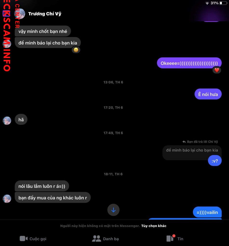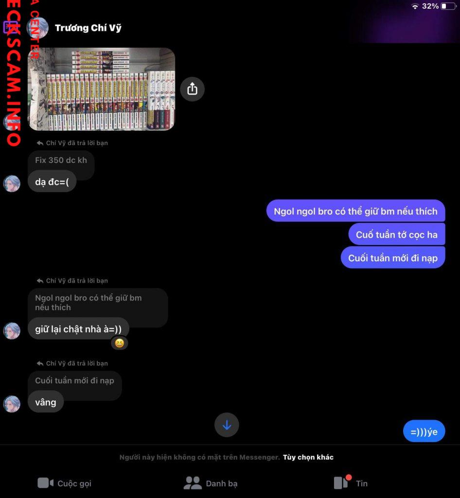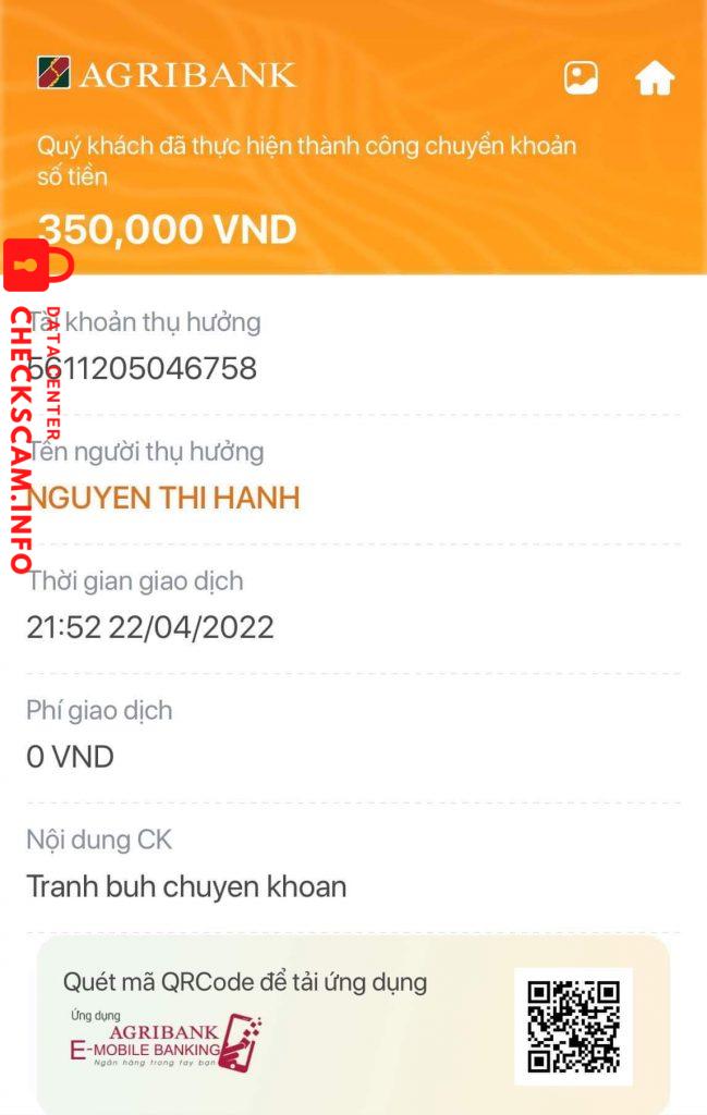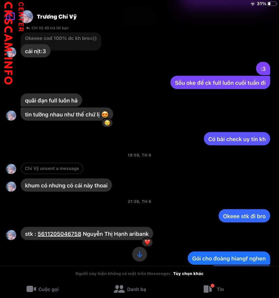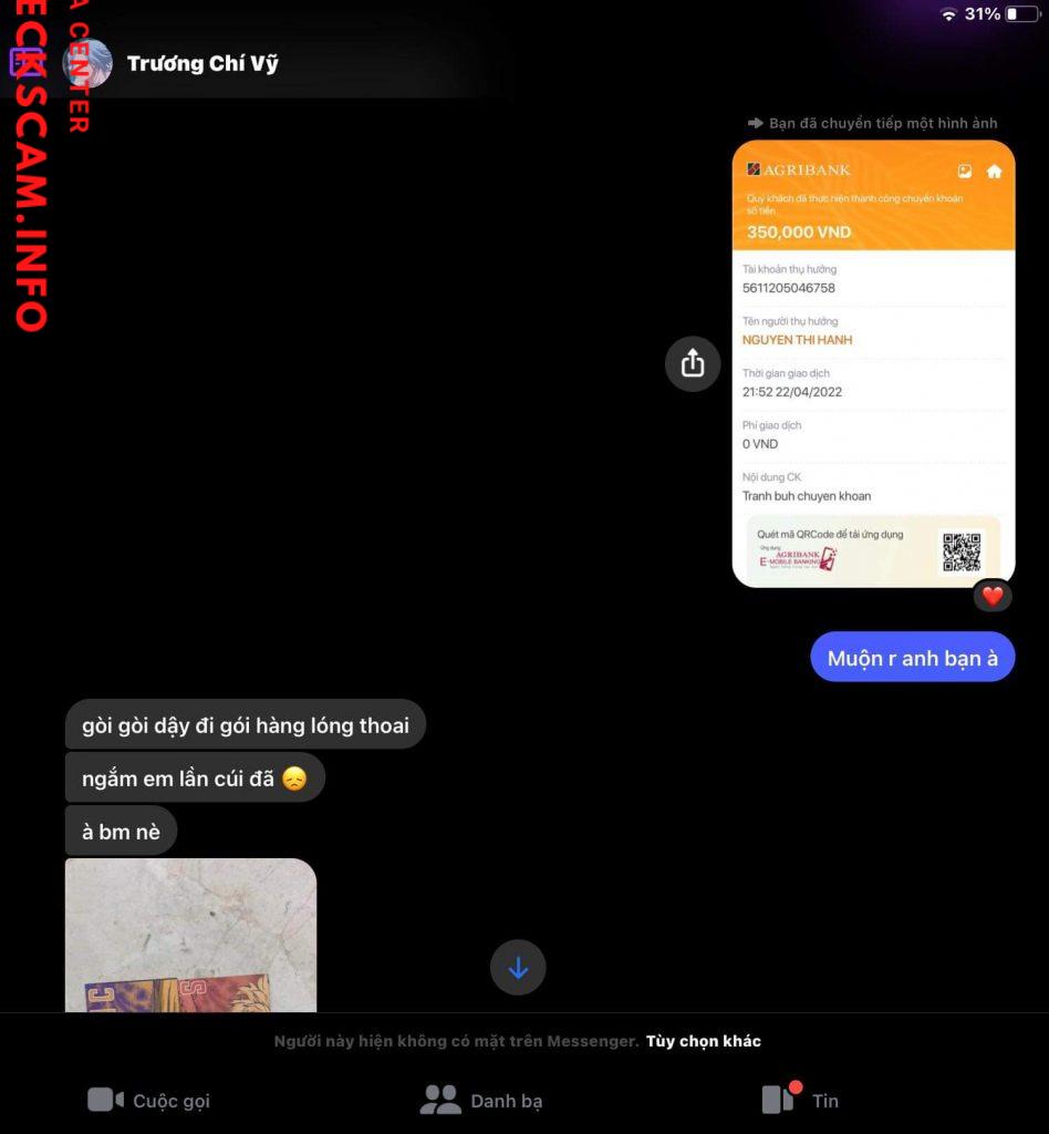 Cảnh báo kẻ lừa đảo: Nguyễn Thị Hạnh Đã báo cáo: November 16, 2024 Thông tin kẻ lừa đảo Họ và tên: Nguyễn Thị Hạnh Cổng thanh toán: Agribank Tài khoản thanh toán: 5611205046758 Danh mục: Lừa đảo mua bán Nguồn: Checkscam Tệp bằng chứng Mô tả báo cáo Lừa chuyển tiền hàng mua truyện xong chặn Bình luận Bình luận của bạn Thêm bình luận Chưa có bình luận nào. Hãy là người đầu tiên chia sẻ kinh nghiệm của bạn với kẻ lừa đảo này.