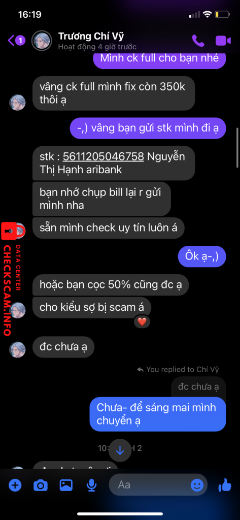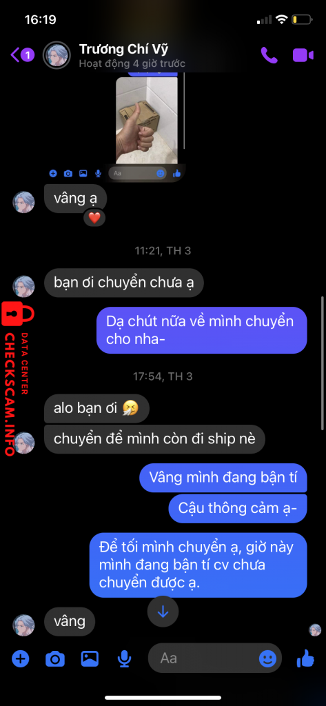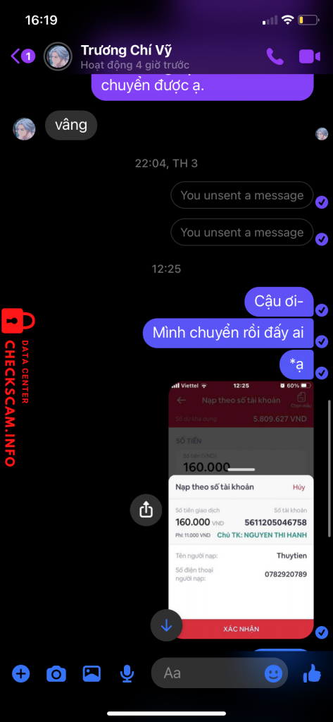 Cảnh báo kẻ lừa đảo: Nguyễn thị hạnh Đã báo cáo: November 16, 2024 Thông tin kẻ lừa đảo Họ và tên: Nguyễn thị hạnh Cổng thanh toán: Agribank Tài khoản thanh toán: 5611205046758 Danh mục: Lừa đảo mua bán Nguồn: Checkscam Tệp bằng chứng Mô tả báo cáo Bay mẹ 320k-) Bình luận Bình luận của bạn Thêm bình luận Chưa có bình luận nào. Hãy là người đầu tiên chia sẻ kinh nghiệm của bạn với kẻ lừa đảo này.