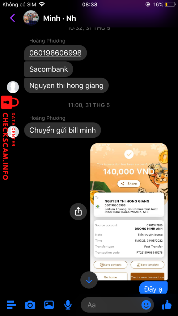 Cảnh báo kẻ lừa đảo: Nguyen thi hong giang Đã báo cáo: November 16, 2024 Thông tin kẻ lừa đảo Họ và tên: Nguyen thi hong giang Cổng thanh toán: Sacombank Tài khoản thanh toán: 060198606998 Danh mục: Lừa đảo mua bán Nguồn: Checkscam Tệp bằng chứng Mô tả báo cáo Ăn mất của mình 140k sống như cứt Bình luận Bình luận của bạn Thêm bình luận Chưa có bình luận nào. Hãy là người đầu tiên chia sẻ kinh nghiệm của bạn với kẻ lừa đảo này.