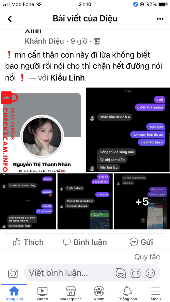 Chuyên đi các gr lừa đảo khu vực hải phòng, tiên lãng, hải dương vĩnh bảo. Đặc điểm là đăng rất nhiều bill khách ck, và đăng bài tự check uy tín bản thân liên tục . Đã lừa rất nhiều ng rồi ạ