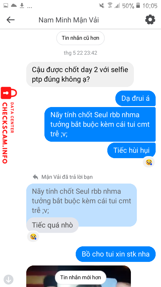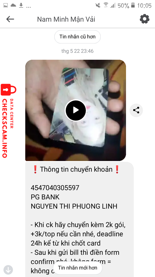 Cảnh báo kẻ lừa đảo: NGUYEN THI PHUONG LINH Đã báo cáo: November 16, 2024 Thông tin kẻ lừa đảo Họ và tên: NGUYEN THI PHUONG LINH Cổng thanh toán: PG BANK Tài khoản thanh toán: 4547040305597 Danh mục: Lừa đảo mua bán Nguồn: Checkscam Tệp bằng chứng Mô tả báo cáo Tới ngày hẹn gửi card thì khóa acc, gỡ ava, không liên hệ được. Bình luận Bình luận của bạn Thêm bình luận Chưa có bình luận nào. Hãy là người đầu tiên chia sẻ kinh nghiệm của bạn với kẻ lừa đảo này.