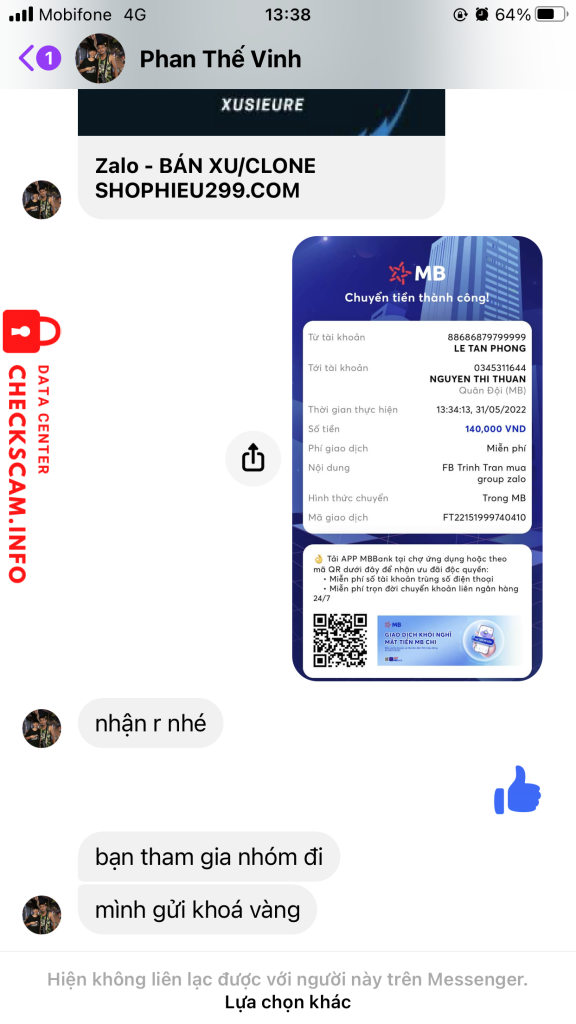 Cảnh báo kẻ lừa đảo: NGUYỄN THỊ THUẬN Đã báo cáo: November 16, 2024 Thông tin kẻ lừa đảo Họ và tên: NGUYỄN THỊ THUẬN Cổng thanh toán: MB Bank Tài khoản thanh toán: 0345311644 Danh mục: Lừa đảo mua bán Nguồn: Checkscam Tệp bằng chứng Mô tả báo cáo ban đầu giả vờ tốt bụng tạo sự tin tưởng,sau khi mình chuyển khoản xong thì block mình luôn => xem file ảnh tài khoản mình đã bị block Bình luận Bình luận của bạn Thêm bình luận Chưa có bình luận nào. Hãy là người đầu tiên chia sẻ kinh nghiệm của bạn với kẻ lừa đảo này.