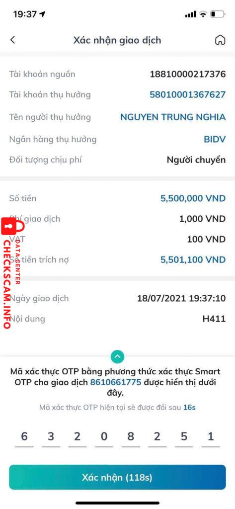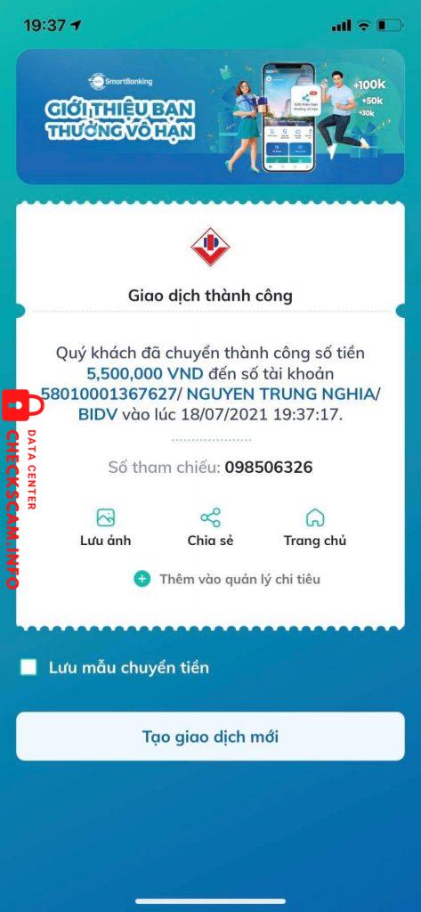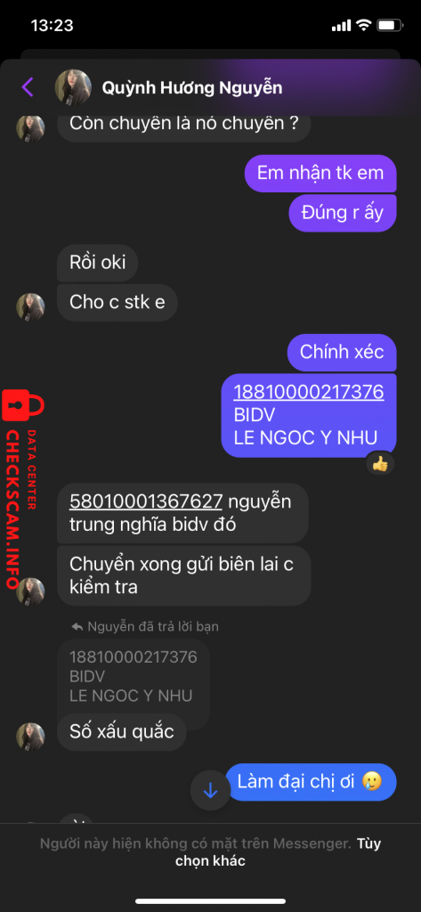 Cảnh báo kẻ lừa đảo: Nguyễn Trung Nghĩa Đã báo cáo: November 16, 2024 Thông tin kẻ lừa đảo Họ và tên: Nguyễn Trung Nghĩa Cổng thanh toán: BIDV Tài khoản thanh toán: 58010001367627 Danh mục: Lừa đảo mua bán Nguồn: Checkscam Tệp bằng chứng Mô tả báo cáo Lừa đảo chuyển tiền phí vay, lừa đảo mua bán Bình luận Bình luận của bạn Thêm bình luận Chưa có bình luận nào. Hãy là người đầu tiên chia sẻ kinh nghiệm của bạn với kẻ lừa đảo này.