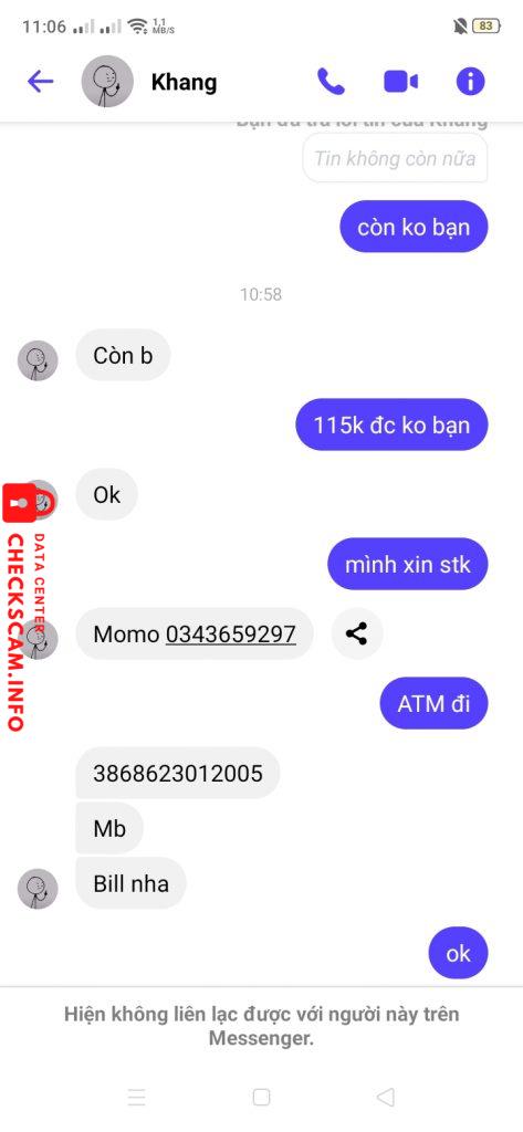 Cảnh báo kẻ lừa đảo: Nguyen Tuan Khang Đã báo cáo: November 16, 2024 Thông tin kẻ lừa đảo Họ và tên: Nguyen Tuan Khang Cổng thanh toán: MBBank Tài khoản thanh toán: 3868623012005 Danh mục: Lừa đảo mua bán Nguồn: Checkscam Tệp bằng chứng Mô tả báo cáo bán ACC Free Fire chuyển khoản xong block Bình luận Bình luận của bạn Thêm bình luận Chưa có bình luận nào. Hãy là người đầu tiên chia sẻ kinh nghiệm của bạn với kẻ lừa đảo này.