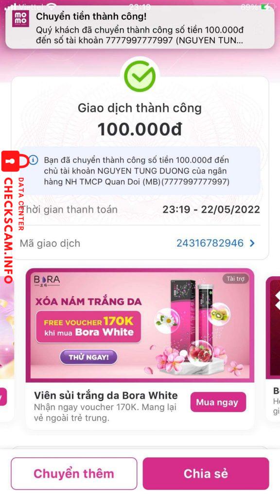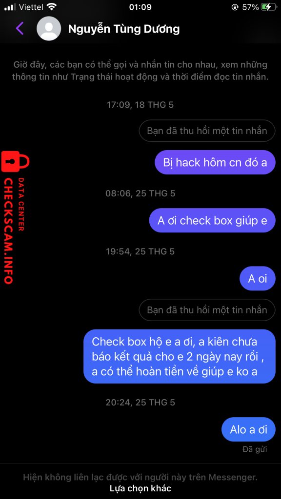 Cảnh báo kẻ lừa đảo: NGUYEN TUNG DUONG Đã báo cáo: November 16, 2024 Thông tin kẻ lừa đảo Họ và tên: NGUYEN TUNG DUONG Cổng thanh toán: MB bank Tài khoản thanh toán: 7777997777997 Danh mục: Lừa đảo mua bán Nguồn: Checkscam Tệp bằng chứng Mô tả báo cáo Lừa đảo chuyển tiền rồi, không thấy hoàn trả, và đã huỷ facebook không thể liên lạc được Bình luận Bình luận của bạn Thêm bình luận Chưa có bình luận nào. Hãy là người đầu tiên chia sẻ kinh nghiệm của bạn với kẻ lừa đảo này.