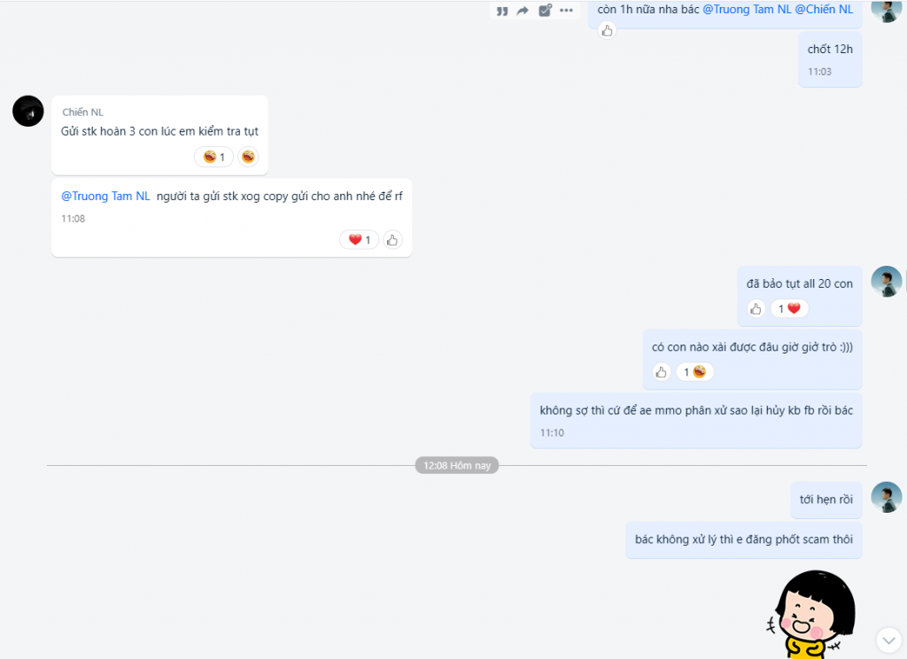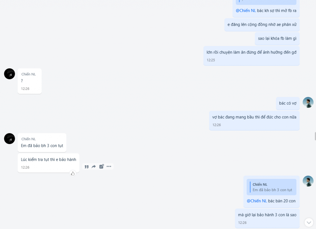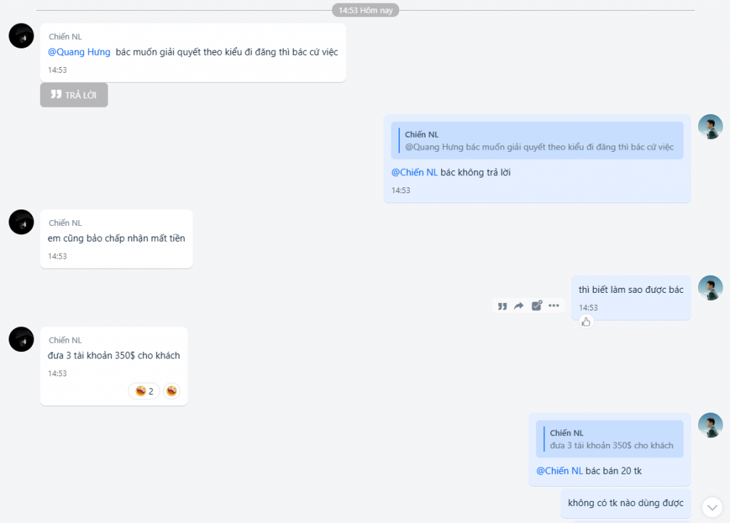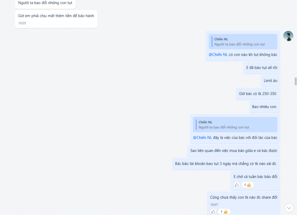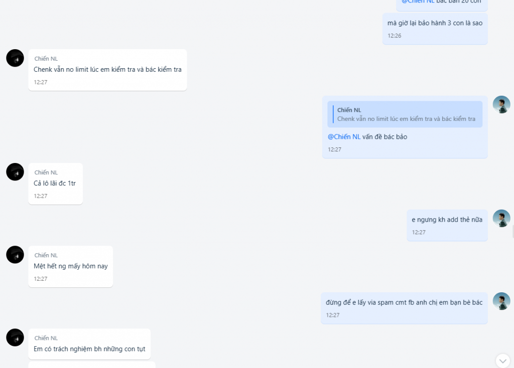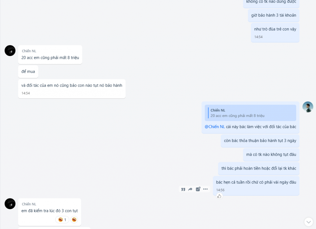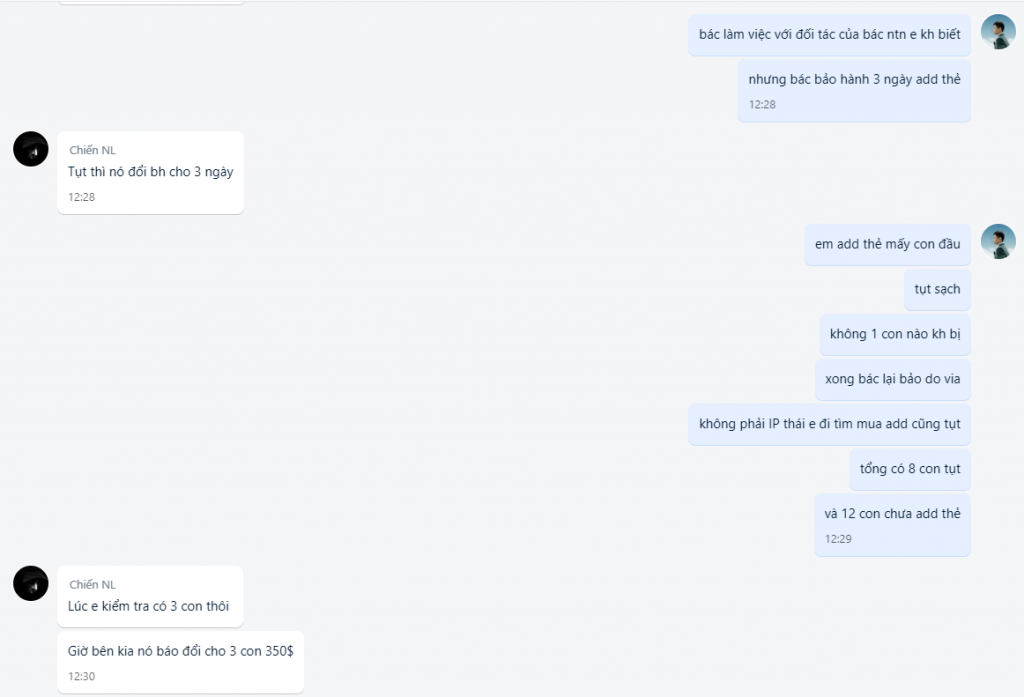+ Ngày 25/5 thì em tìm được khách mua tkcn nlm của bác #Chiến với số lượng 20 tk và cũng có hỏi lại vụ bảo hành bao tụt 3 ngày từ lúc add thẻ còn kêu hàng bao tụt vĩnh viễn bao đổi .