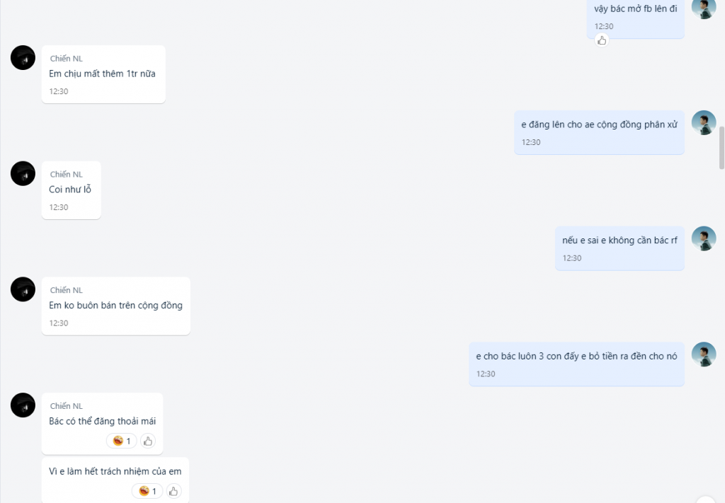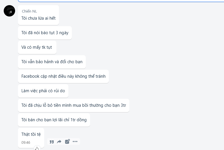+ Ngày 27/5-2/6 sau bao nhiêu lần trốn tránh delay cả tuần với đủ lý do ( đi gặp khách hàng , chở vợ đi khám thai , bận việc ra ngoài không có ở nhà ) thì bác #Chiến đã chính thức scam của em 9tr2 và đổ thừa do bên đối tác gì đó của bác ấy không chịu bảo hành .