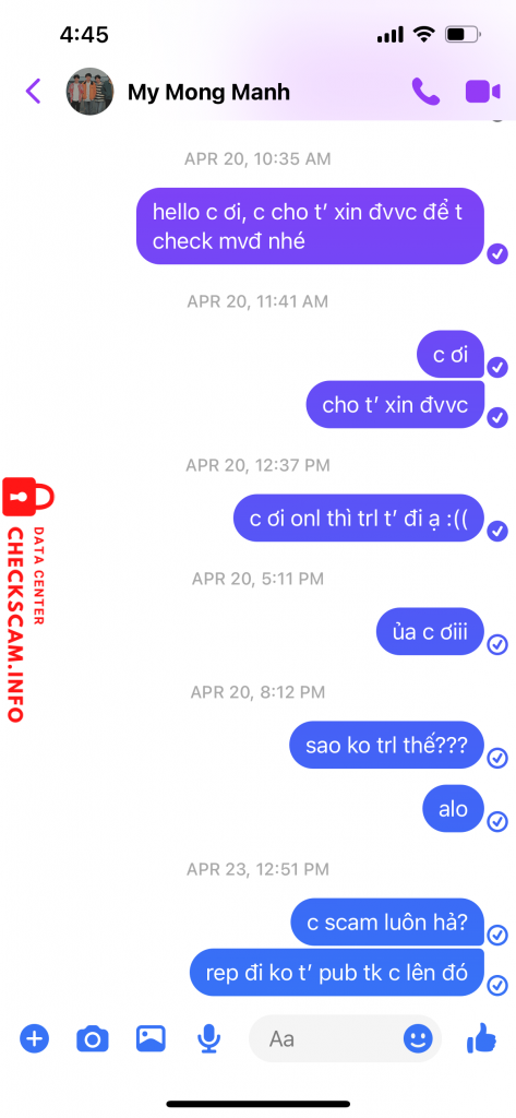 Cảnh báo kẻ lừa đảo: NGUYEN VAN DUNG Đã báo cáo: November 16, 2024 Thông tin kẻ lừa đảo Họ và tên: NGUYEN VAN DUNG Cổng thanh toán: Vietcombank Tài khoản thanh toán: 1019685827 Danh mục: Lừa đảo mua bán Nguồn: Checkscam Tệp bằng chứng Mô tả báo cáo NHẬN TIỀN NHƯNG KHÔNG GỬI HÀNG, KHÔNG LIÊN LẠC ĐƯỢC Bình luận Bình luận của bạn Thêm bình luận Chưa có bình luận nào. Hãy là người đầu tiên chia sẻ kinh nghiệm của bạn với kẻ lừa đảo này.