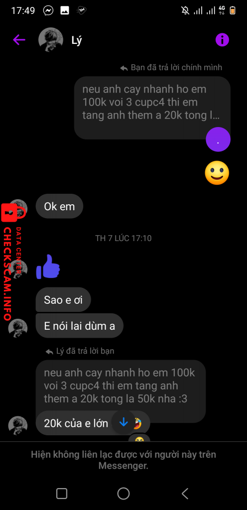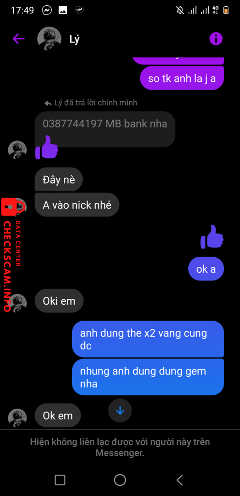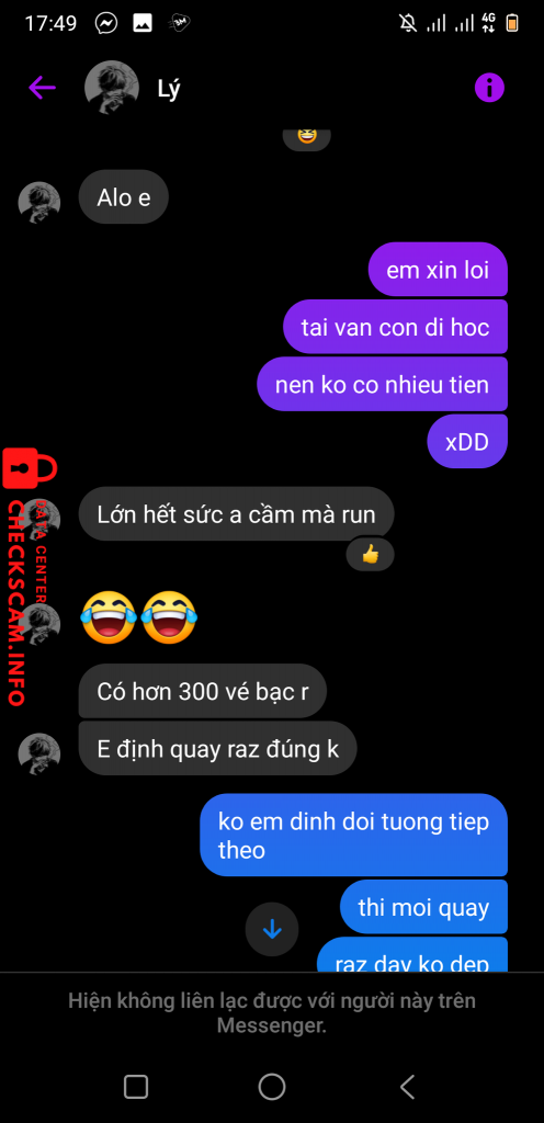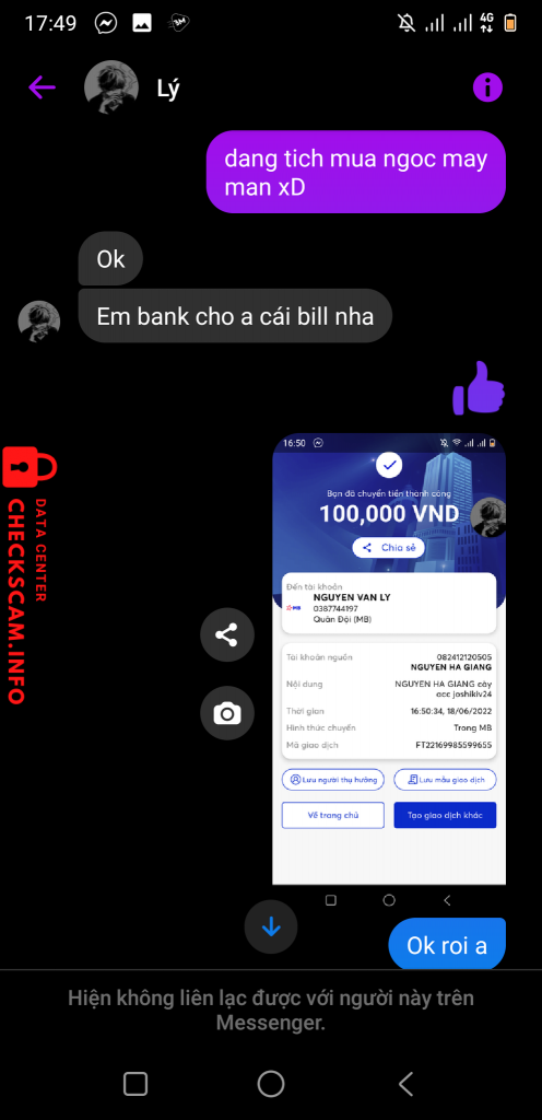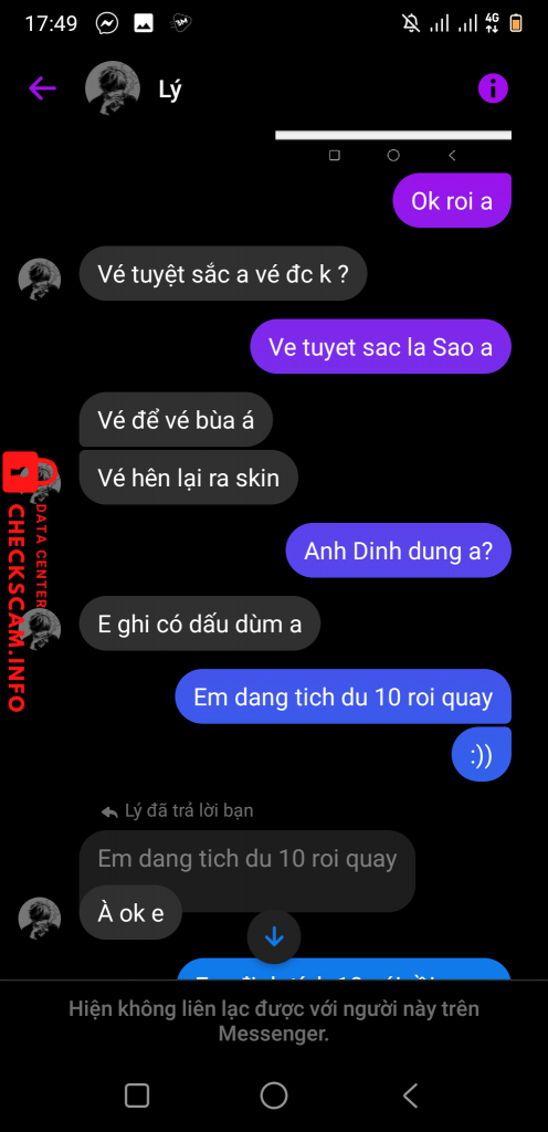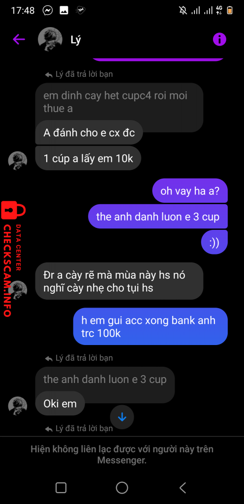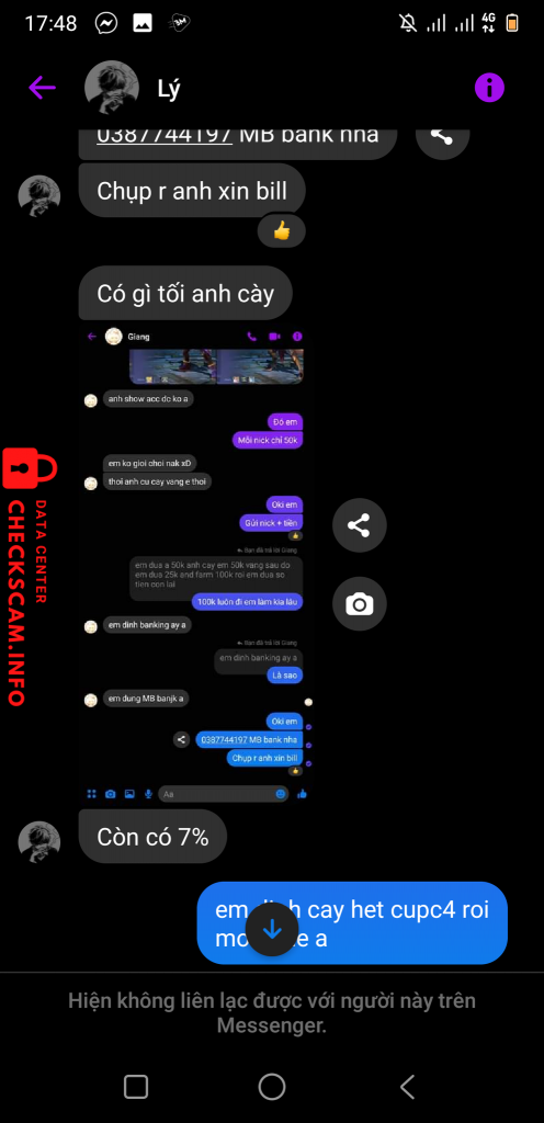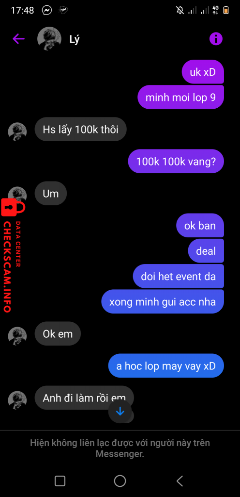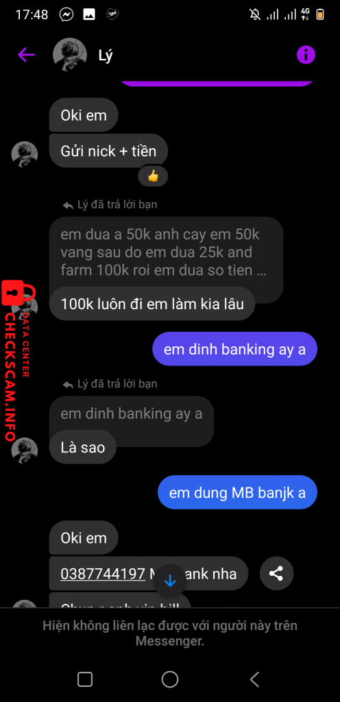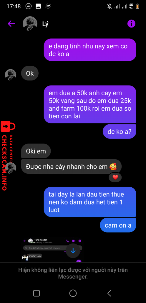 Anh ta đã lừa tồi khi gửi tài khoàn sau đó gửi tiền và nói sẽ giúp tôi hoàn thanh nhiệm vụ nhanh nhất có thể sau 3 ngày chưa thấy động tĩnh tôi đã gọi và nhắc anh ta sau đó anh ta block tôi và chạy đi