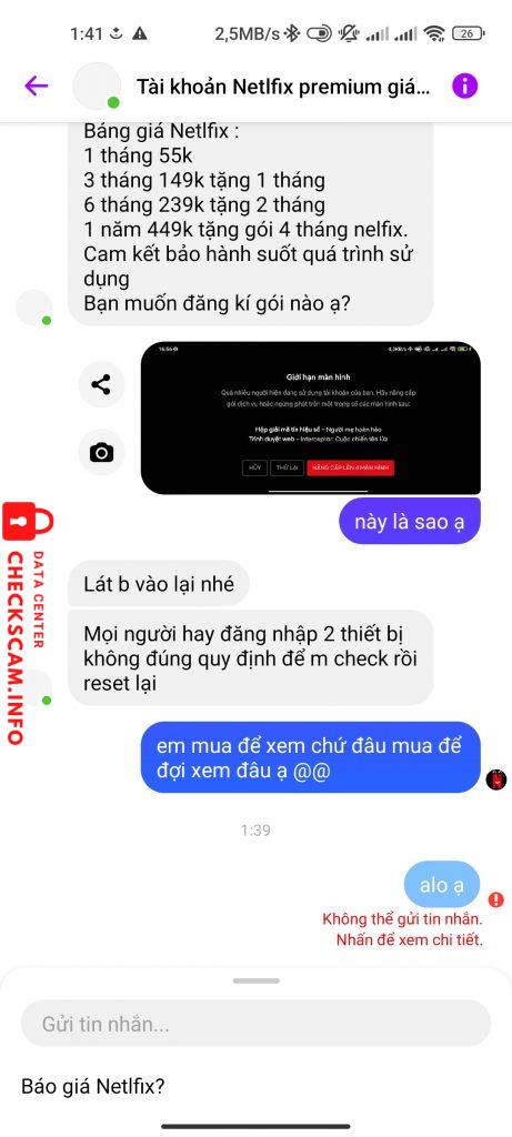 Cảnh báo kẻ lừa đảo: NGUYỄN VĂN TÌNH Đã báo cáo: November 16, 2024 Thông tin kẻ lừa đảo Họ và tên: NGUYỄN VĂN TÌNH Cổng thanh toán: Agribank Tài khoản thanh toán: 2209281003867 Danh mục: Lừa đảo mua bán Nguồn: Checkscam Tệp bằng chứng Mô tả báo cáo mua tk netflix 3tháng bị chặn sau 3hôm Bình luận Bình luận của bạn Thêm bình luận Chưa có bình luận nào. Hãy là người đầu tiên chia sẻ kinh nghiệm của bạn với kẻ lừa đảo này.