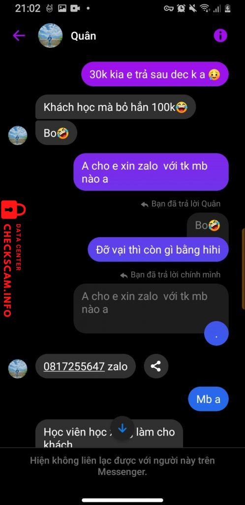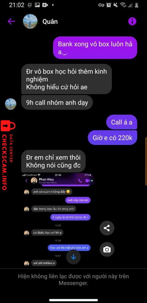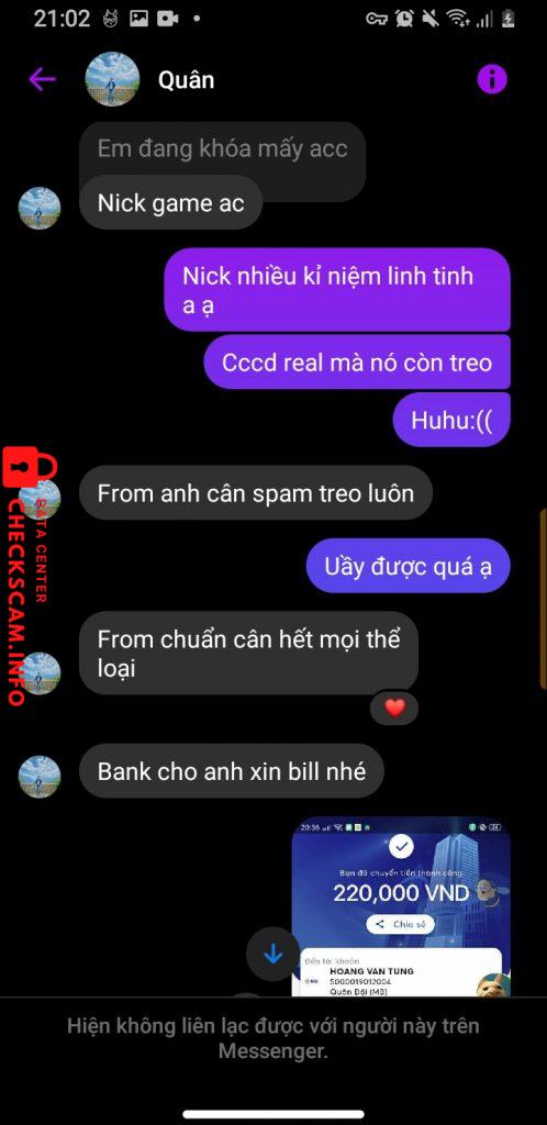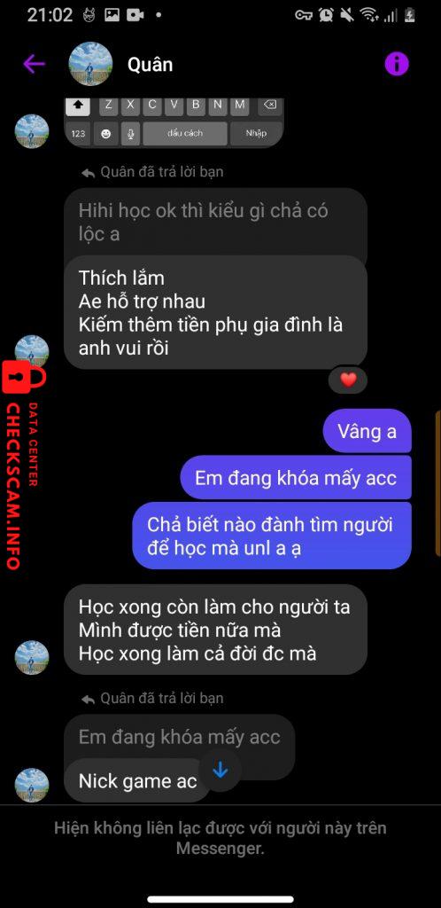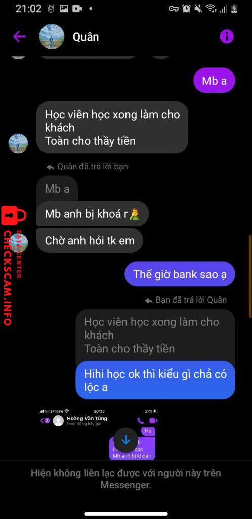 – tôi muốn học unlock tài khoản và đã đăng bài lên gruop A đã vào cmt và tôi đã nhắn tin như những hình ảnh tôi đã cấp, A nói stk của A đã bị khóa và A nhắn tin cho B kêu B nhận tiền dùm, sau khi tôi đã chuyển tiền cho A thì A đã block Facebook của tôi