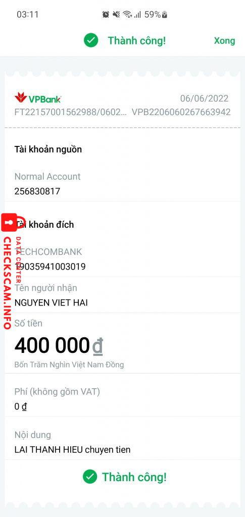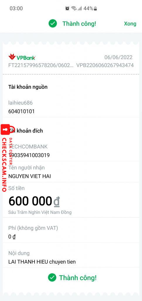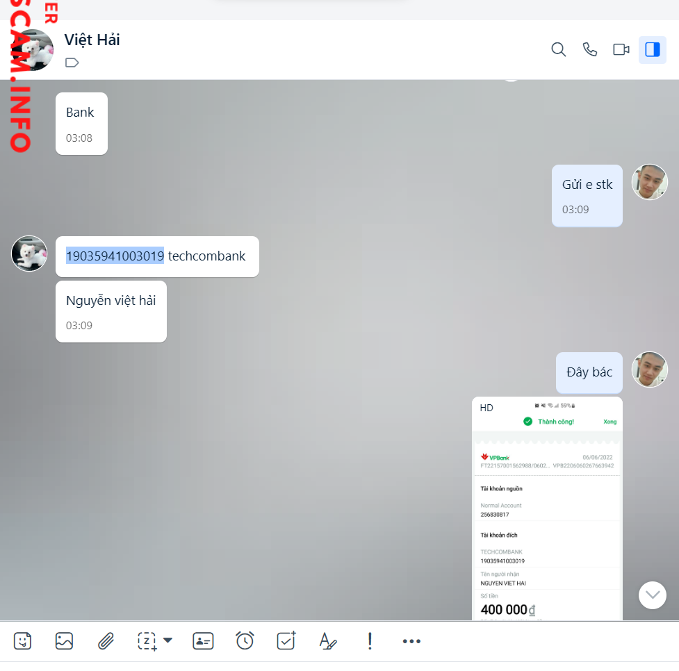Cảnh báo kẻ lừa đảo: Nguyễn việt hải Đã báo cáo: November 16, 2024 Thông tin kẻ lừa đảo Họ và tên: Nguyễn việt hải Cổng thanh toán: Techcombank Tài khoản thanh toán: 19035941003019 Danh mục: Lừa đảo mua bán Nguồn: Checkscam Tệp bằng chứng Mô tả báo cáo Lừa đảo pay nợ tài khoản quảng cáo. Pay được một lần lấy uy tín sau đó lừa đảo Bình luận Bình luận của bạn Thêm bình luận Chưa có bình luận nào. Hãy là người đầu tiên chia sẻ kinh nghiệm của bạn với kẻ lừa đảo này.