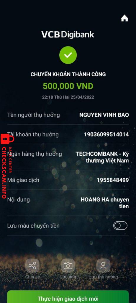 Cảnh báo kẻ lừa đảo: Nguyễn Vĩnh Bảo Đã báo cáo: November 16, 2024 Thông tin kẻ lừa đảo Họ và tên: Nguyễn Vĩnh Bảo Cổng thanh toán: Techcombank Tài khoản thanh toán: 19036099514014 Danh mục: Lừa đảo mua bán Nguồn: Checkscam Tệp bằng chứng Mô tả báo cáo Lừa đảo code Nodejs . Đoạn chát đã bị xóa. Telegram đã đổi tên và user ngay sau khi nhận tiền cọc đợt 2 Bình luận Bình luận của bạn Thêm bình luận Chưa có bình luận nào. Hãy là người đầu tiên chia sẻ kinh nghiệm của bạn với kẻ lừa đảo này.