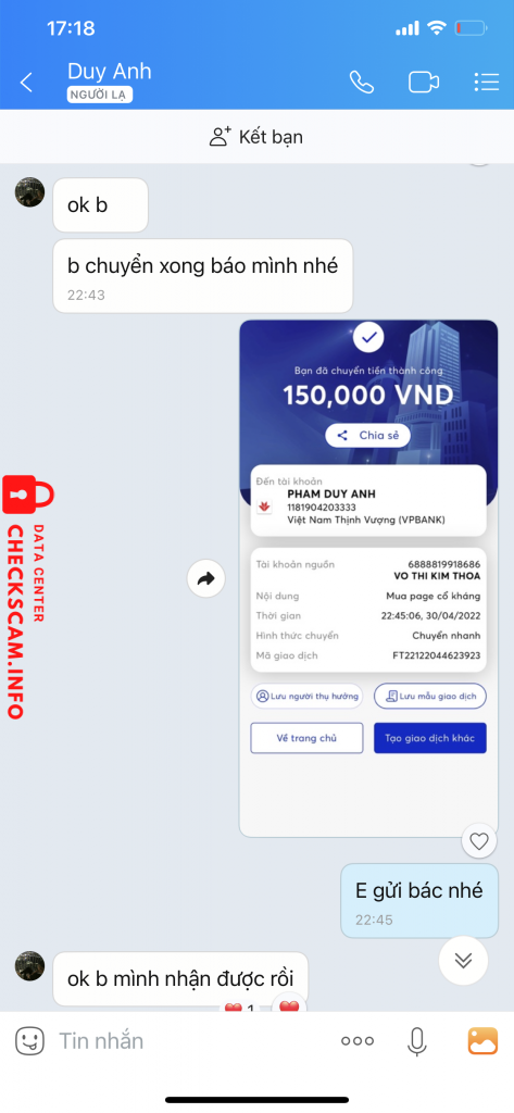 Cảnh báo kẻ lừa đảo: Phạm Duy Anh Đã báo cáo: November 16, 2024 Thông tin kẻ lừa đảo Họ và tên: Phạm Duy Anh Cổng thanh toán: VP bank Tài khoản thanh toán: 1181904203333 Danh mục: Lừa đảo mua bán Nguồn: Checkscam Tệp bằng chứng Mô tả báo cáo Scam lừa đảo. Mua nguyên liệu, bank xong chặn zalo luôn ạ. Bình luận Bình luận của bạn Thêm bình luận Chưa có bình luận nào. Hãy là người đầu tiên chia sẻ kinh nghiệm của bạn với kẻ lừa đảo này.