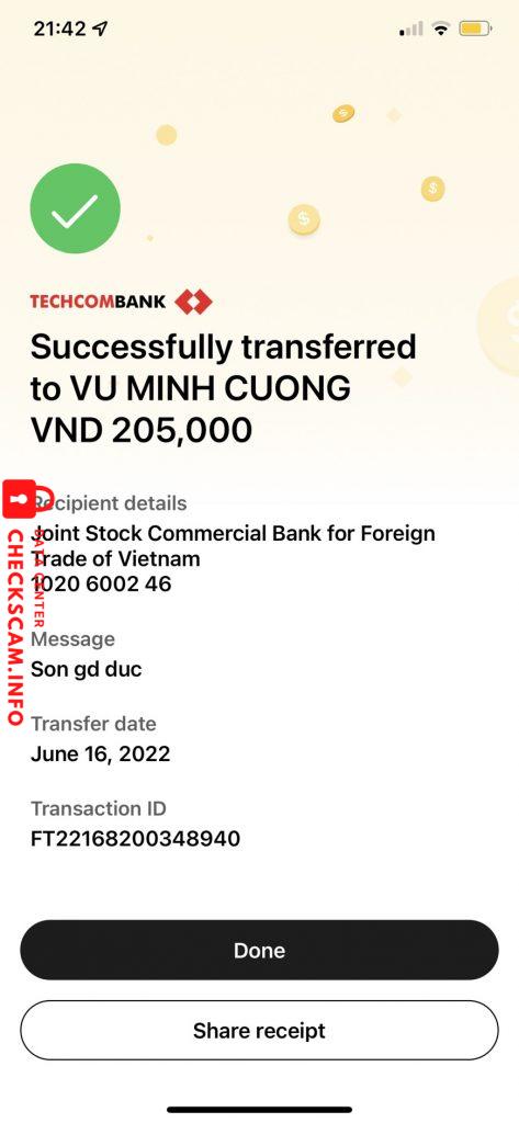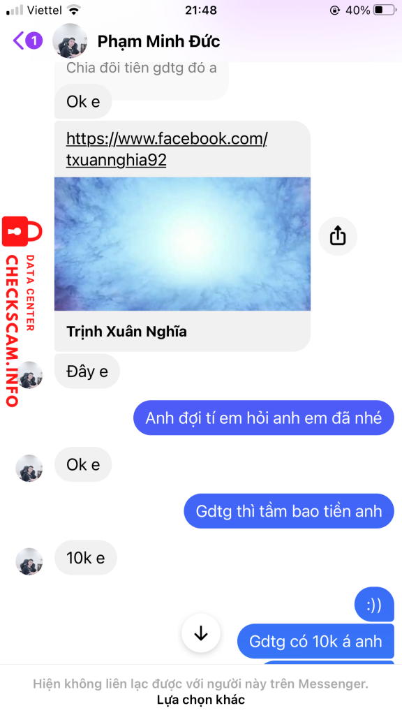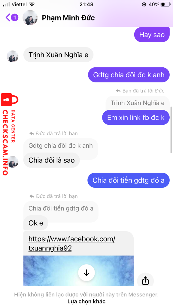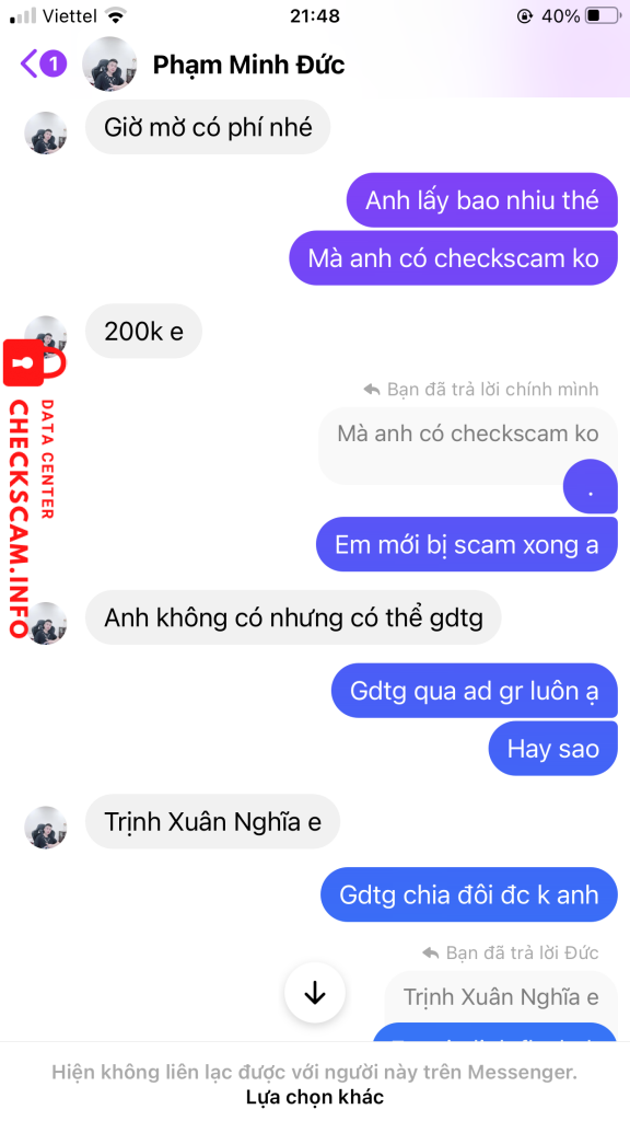 Cảnh báo kẻ lừa đảo: Phạm Minh Đức Đã báo cáo: November 16, 2024 Thông tin kẻ lừa đảo Họ và tên: Phạm Minh Đức Cổng thanh toán: Vietcombank Tài khoản thanh toán: 120600246 Danh mục: Lừa đảo mua bán Nguồn: Checkscam Tệp bằng chứng Mô tả báo cáo Giả làm gdtg rồi scam Bình luận Bình luận của bạn Thêm bình luận Chưa có bình luận nào. Hãy là người đầu tiên chia sẻ kinh nghiệm của bạn với kẻ lừa đảo này.