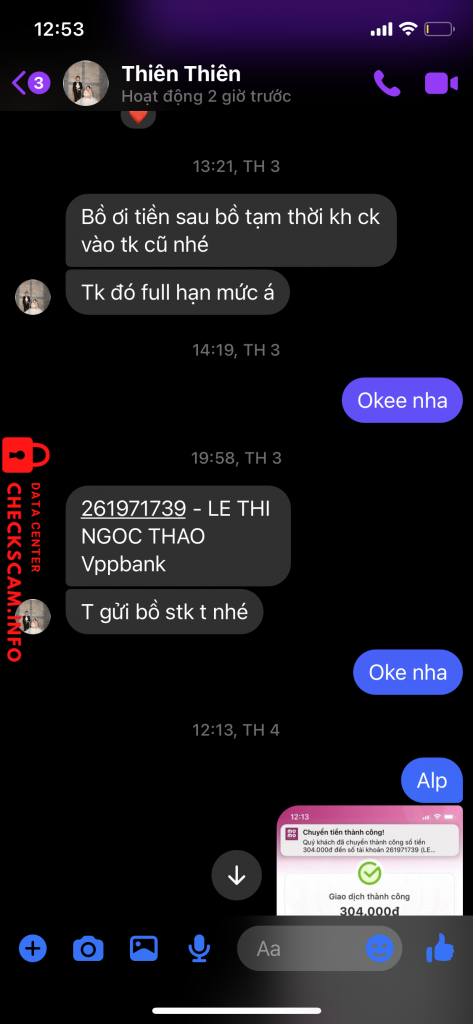 Cảnh báo kẻ lừa đảo: Pham thanh dat Đã báo cáo: November 16, 2024 Thông tin kẻ lừa đảo Họ và tên: Pham thanh dat Cổng thanh toán: Vppbank Tài khoản thanh toán: 261971739 Danh mục: Lừa đảo mua bán Nguồn: Checkscam Tệp bằng chứng Mô tả báo cáo LỪA ĐẢO CHIẾM ĐOẠT TÀI SẢN GIÁ TRỊ LỚN Bình luận Bình luận của bạn Thêm bình luận Chưa có bình luận nào. Hãy là người đầu tiên chia sẻ kinh nghiệm của bạn với kẻ lừa đảo này.