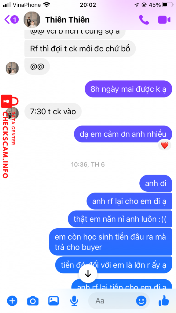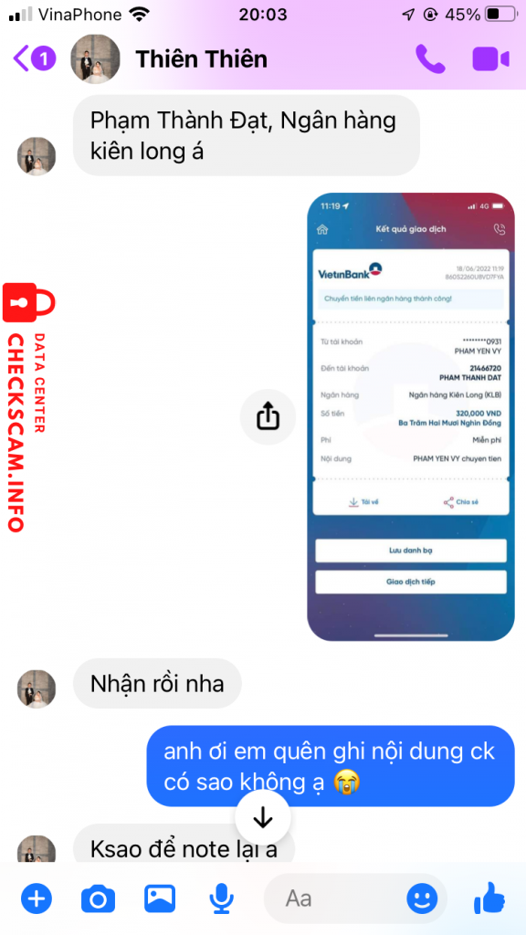 Cảnh báo kẻ lừa đảo: Phạm Thành Đạt Đã báo cáo: November 16, 2024 Thông tin kẻ lừa đảo Họ và tên: Phạm Thành Đạt Cổng thanh toán: Kiên Long Bank Tài khoản thanh toán: 21466720 Danh mục: Lừa đảo mua bán Nguồn: Checkscam Tệp bằng chứng Mô tả báo cáo scam của tôi 320k Bình luận Bình luận của bạn Thêm bình luận Chưa có bình luận nào. Hãy là người đầu tiên chia sẻ kinh nghiệm của bạn với kẻ lừa đảo này.