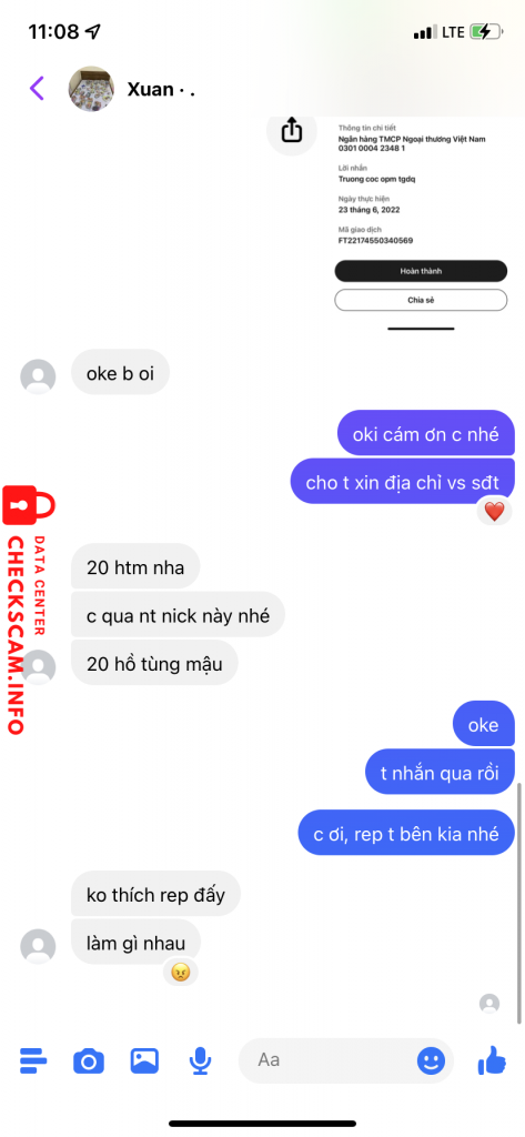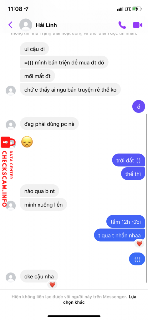 Cảnh báo kẻ lừa đảo: Pham Thi Hai Linh Đã báo cáo: November 16, 2024 Thông tin kẻ lừa đảo Họ và tên: Pham Thi Hai Linh Cổng thanh toán: Vietcombank Tài khoản thanh toán: 0301000423481 Danh mục: Lừa đảo mua bán Nguồn: Checkscam Tệp bằng chứng Mô tả báo cáo Scam truyện tranh, bán giá rất rẻ và bắt cọc Bình luận Bình luận của bạn Thêm bình luận Chưa có bình luận nào. Hãy là người đầu tiên chia sẻ kinh nghiệm của bạn với kẻ lừa đảo này.