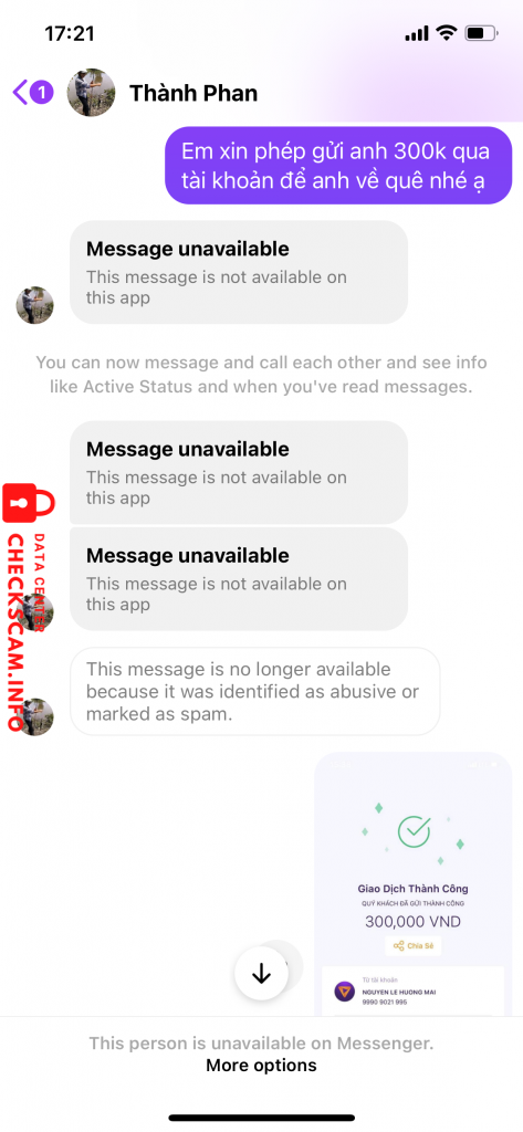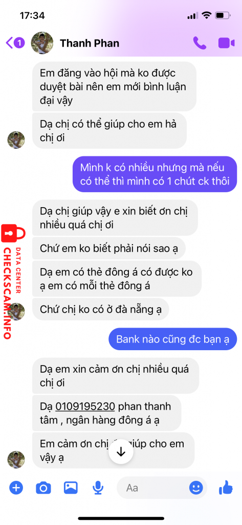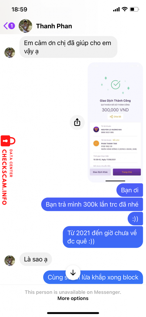 Cảnh báo kẻ lừa đảo: Phan Thanh Tam Đã báo cáo: November 16, 2024 Thông tin kẻ lừa đảo Họ và tên: Phan Thanh Tam Cổng thanh toán: Dong A Tài khoản thanh toán: 0109195230 Danh mục: Lừa đảo mua bán Nguồn: Checkscam Tệp bằng chứng Mô tả báo cáo Chuyên gia comment ở các Facebook page công cộng để giả vờ xin tiền về quê!!! Bình luận Bình luận của bạn Thêm bình luận Chưa có bình luận nào. Hãy là người đầu tiên chia sẻ kinh nghiệm của bạn với kẻ lừa đảo này.