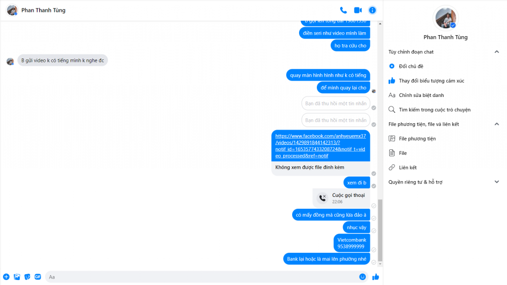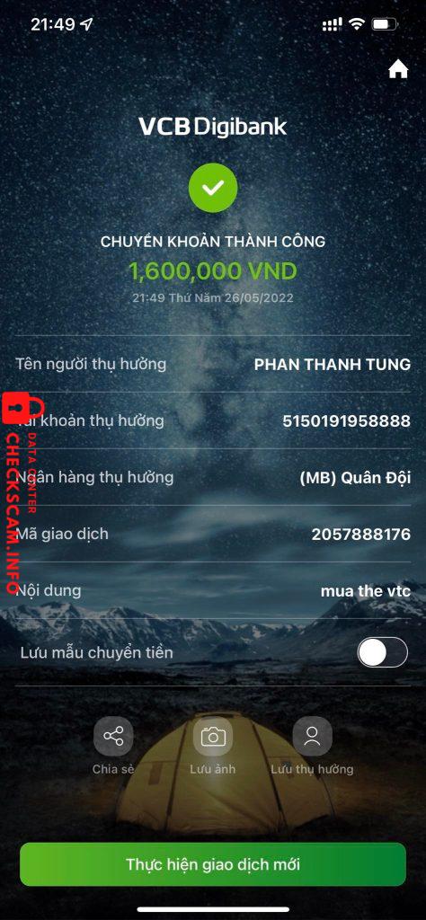 Cảnh báo kẻ lừa đảo: Phan Thanh Tùng Đã báo cáo: November 16, 2024 Thông tin kẻ lừa đảo Họ và tên: Phan Thanh Tùng Cổng thanh toán: MB BANK Tài khoản thanh toán: 5150191958888 Danh mục: Lừa đảo mua bán Nguồn: Checkscam Tệp bằng chứng Mô tả báo cáo Lừa đảo bán thẻ cào VTC Bình luận Bình luận của bạn Thêm bình luận Chưa có bình luận nào. Hãy là người đầu tiên chia sẻ kinh nghiệm của bạn với kẻ lừa đảo này.