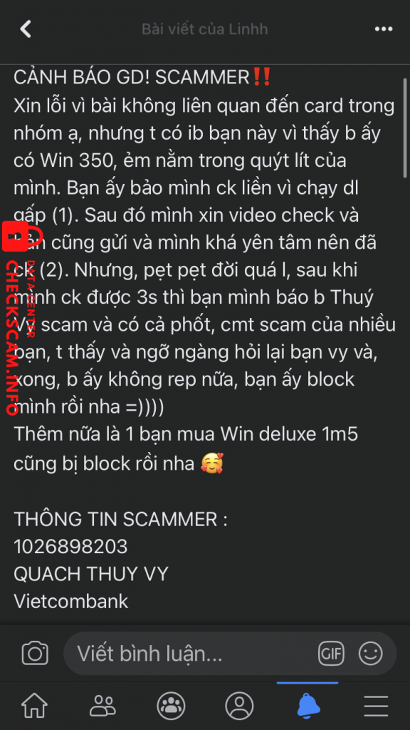 Lừa tiền của rất nhiều người mua hàng, nhận tiền xong trả lời tin nhắn 1-2 câu và sau đó ẩn inbox người mua, block. Đã lừa số tiền hàng triệu trong các group mua bán đồ Hàn, card trên facebook. Không trả lại tiền. Có bài phốt đàng hoàng trên facebook, vì nhiều đối tượng bị lừa nên comment sẽ không phù hợp với người lớn tuổi