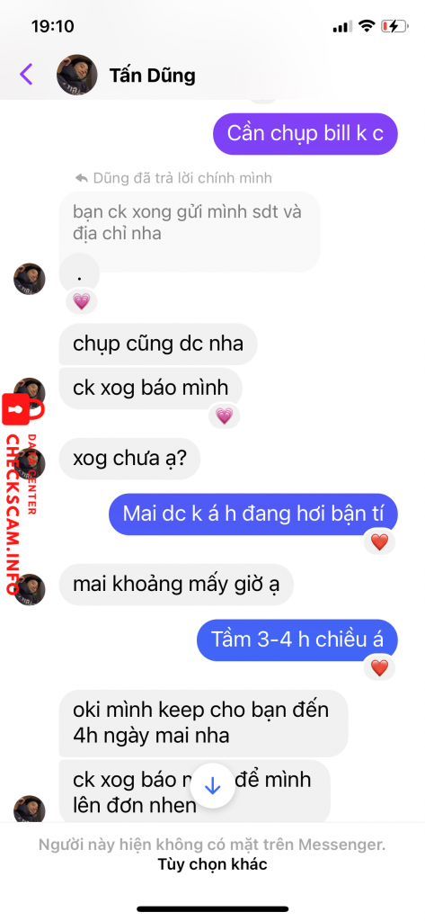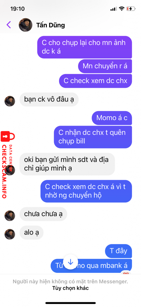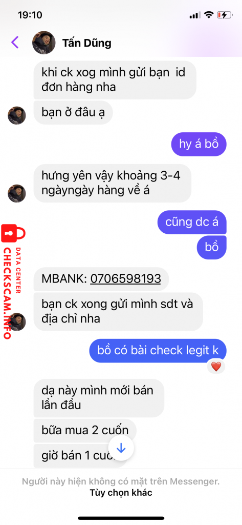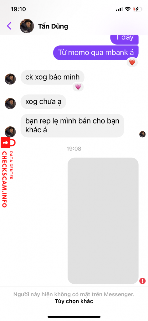 Cảnh báo kẻ lừa đảo: Tấn dũng Đã báo cáo: November 16, 2024 Thông tin kẻ lừa đảo Họ và tên: Tấn dũng Số điện thoại: 0706598193 Cổng thanh toán: Mb bank Tài khoản thanh toán: 0706598193 Danh mục: Lừa đảo mua bán Nguồn: Checkscam Tệp bằng chứng Mô tả báo cáo Scam truyện Bình luận Bình luận của bạn Thêm bình luận Chưa có bình luận nào. Hãy là người đầu tiên chia sẻ kinh nghiệm của bạn với kẻ lừa đảo này.