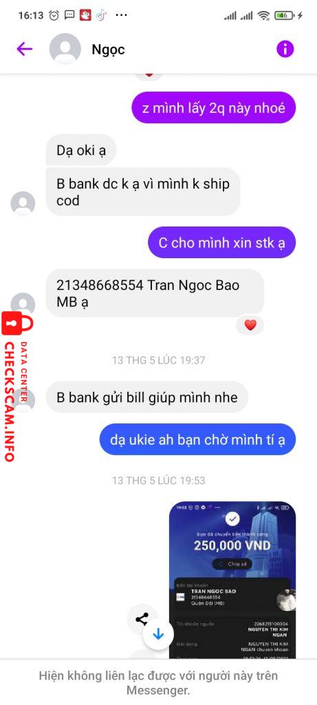 Cảnh báo kẻ lừa đảo: Tran Bao Ngpc Đã báo cáo: November 16, 2024 Thông tin kẻ lừa đảo Họ và tên: Tran Bao Ngpc Cổng thanh toán: MB Bank Tài khoản thanh toán: 21348668554 Danh mục: Lừa đảo mua bán Nguồn: Checkscam Tệp bằng chứng Mô tả báo cáo Chủ tài khoản ăn cắp 250k của tôi và có cả những người khác bị tk này lấy cắp tiền Bình luận Bình luận của bạn Thêm bình luận Chưa có bình luận nào. Hãy là người đầu tiên chia sẻ kinh nghiệm của bạn với kẻ lừa đảo này.
