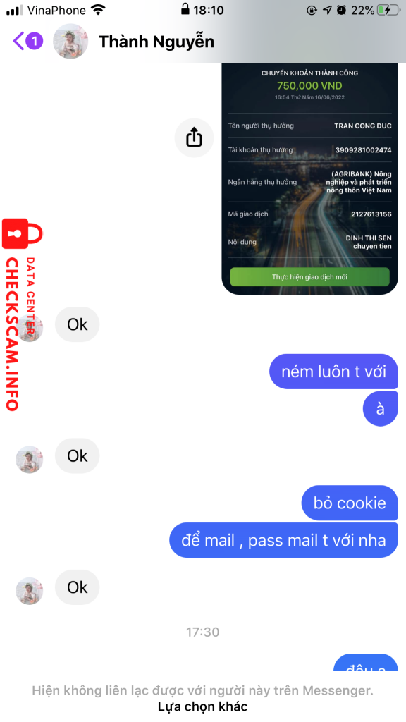 Cảnh báo kẻ lừa đảo: Tran Cong Duc Đã báo cáo: November 16, 2024 Thông tin kẻ lừa đảo Họ và tên: Tran Cong Duc Cổng thanh toán: agribank Tài khoản thanh toán: 3909281002474 Danh mục: Lừa đảo mua bán Nguồn: Checkscam Tệp bằng chứng Mô tả báo cáo lừa đảo bán 1k clone giá 1,5m Bình luận Bình luận của bạn Thêm bình luận Chưa có bình luận nào. Hãy là người đầu tiên chia sẻ kinh nghiệm của bạn với kẻ lừa đảo này.