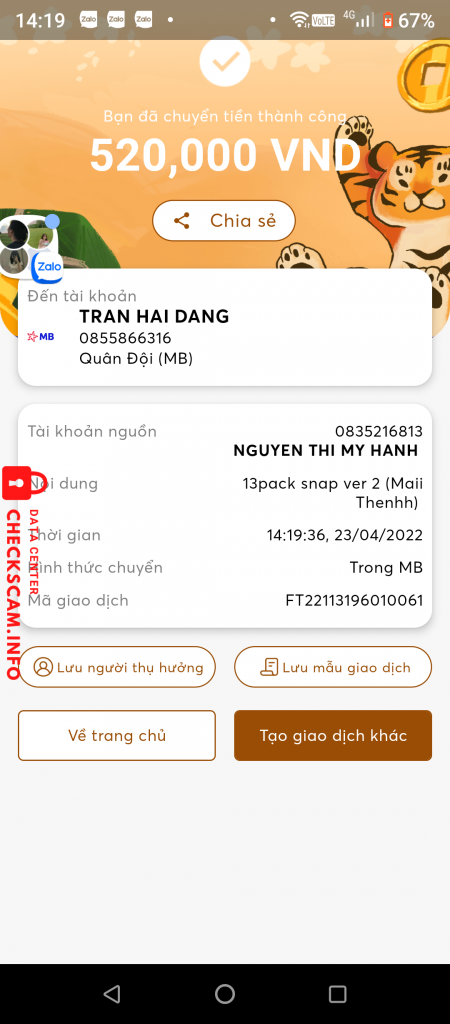 Cảnh báo kẻ lừa đảo: TRAN HAI DANG Đã báo cáo: November 16, 2024 Thông tin kẻ lừa đảo Họ và tên: TRAN HAI DANG Cổng thanh toán: TMCP Quân Đội Tài khoản thanh toán: 0855866316 Danh mục: Lừa đảo mua bán Nguồn: Checkscam Tệp bằng chứng Mô tả báo cáo Mình ck cho bạn đó 520k xong rồi sủi lun? Bình luận Bình luận của bạn Thêm bình luận Chưa có bình luận nào. Hãy là người đầu tiên chia sẻ kinh nghiệm của bạn với kẻ lừa đảo này.