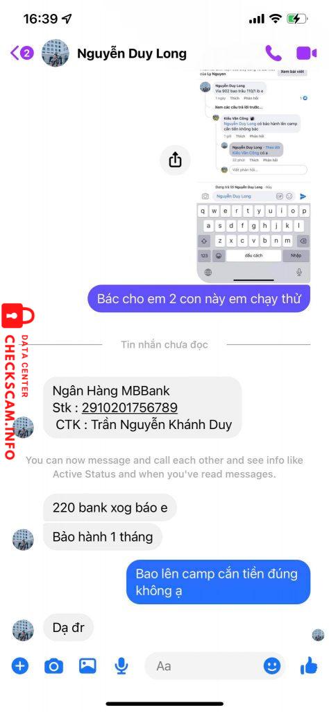 Cảnh báo kẻ lừa đảo: Trần Nguyễn Khánh Duy Đã báo cáo: November 16, 2024 Thông tin kẻ lừa đảo Họ và tên: Trần Nguyễn Khánh Duy Cổng thanh toán: Mbbank Tài khoản thanh toán: 2910201756789 Danh mục: Lừa đảo mua bán Nguồn: Checkscam Tệp bằng chứng Mô tả báo cáo scam tiền mua via Bình luận Bình luận của bạn Thêm bình luận Chưa có bình luận nào. Hãy là người đầu tiên chia sẻ kinh nghiệm của bạn với kẻ lừa đảo này.