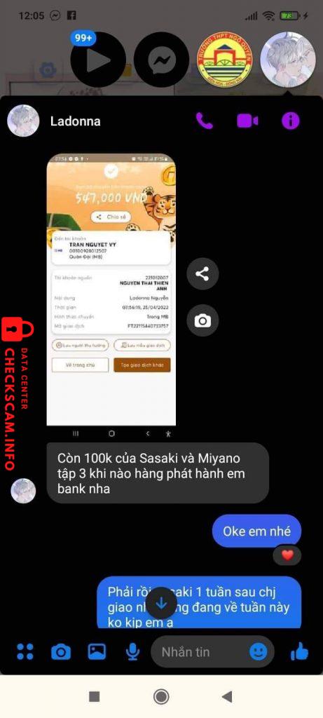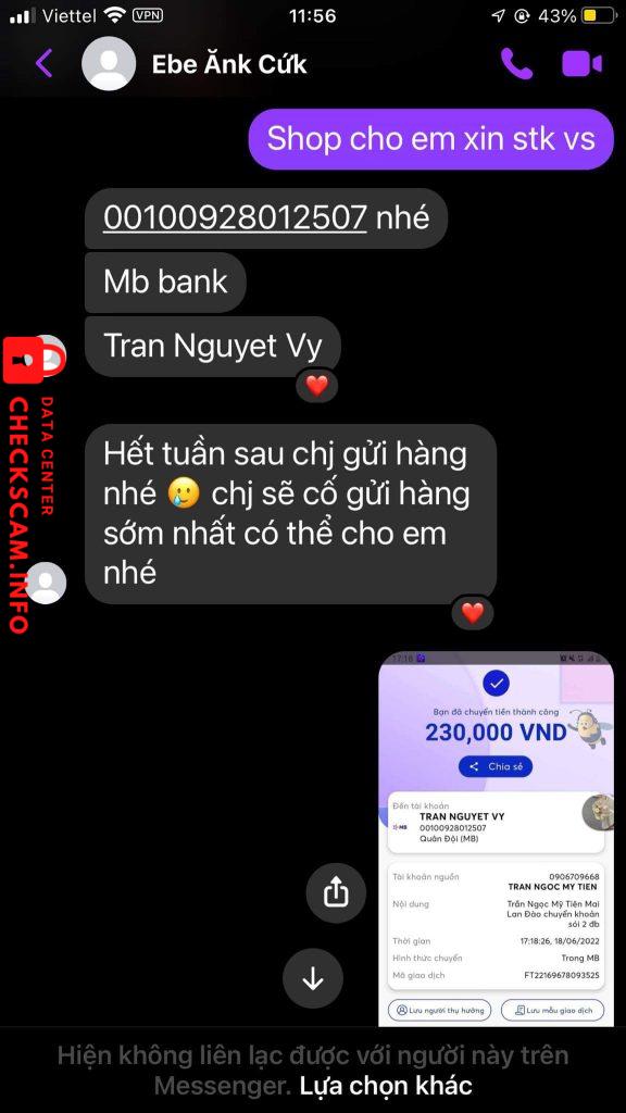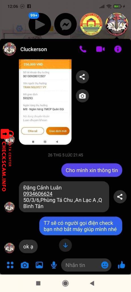 Cảnh báo kẻ lừa đảo: Tran Nguyet VY Đã báo cáo: November 16, 2024 Thông tin kẻ lừa đảo Họ và tên: Tran Nguyet VY Cổng thanh toán: mb bank Tài khoản thanh toán: 00100928012507 Danh mục: Lừa đảo mua bán Nguồn: Checkscam Tệp bằng chứng Mô tả báo cáo Số tài khoản trên đã dùng acc Facebook có tên Ebe Ăn Cứk/Ebe Ume BL để thực hiện hành vi lừa đảo trên 1 triệu đồng. Bình luận Bình luận của bạn Thêm bình luận Chưa có bình luận nào. Hãy là người đầu tiên chia sẻ kinh nghiệm của bạn với kẻ lừa đảo này.