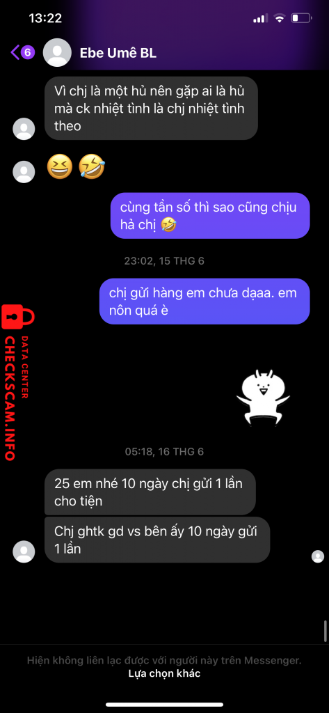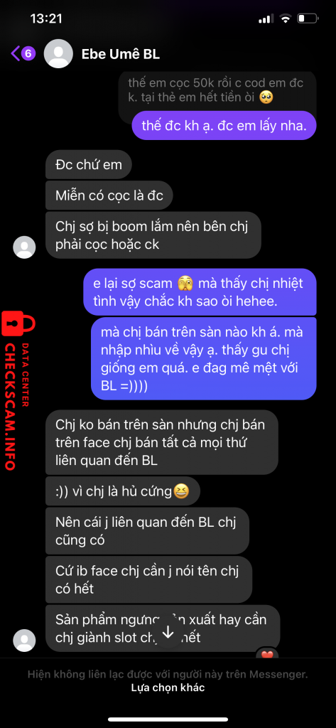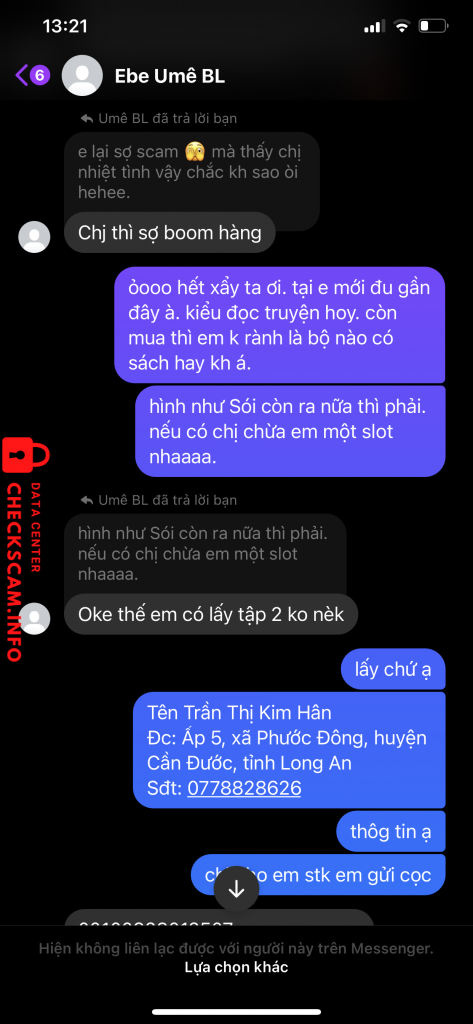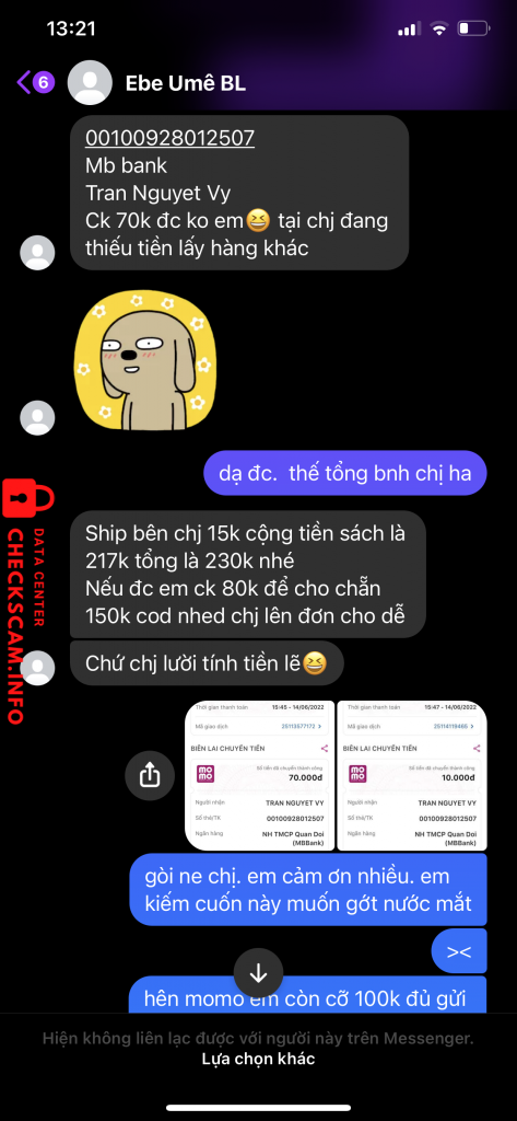 Cảnh báo kẻ lừa đảo: Trần Nguyệt Vy Đã báo cáo: November 16, 2024 Thông tin kẻ lừa đảo Họ và tên: Trần Nguyệt Vy Cổng thanh toán: MB Bank Tài khoản thanh toán: 00100928012507 Danh mục: Lừa đảo mua bán Nguồn: Checkscam Tệp bằng chứng Mô tả báo cáo lừa chuyển khoản tiền trước. sau đó chặn Bình luận Bình luận của bạn Thêm bình luận Chưa có bình luận nào. Hãy là người đầu tiên chia sẻ kinh nghiệm của bạn với kẻ lừa đảo này.