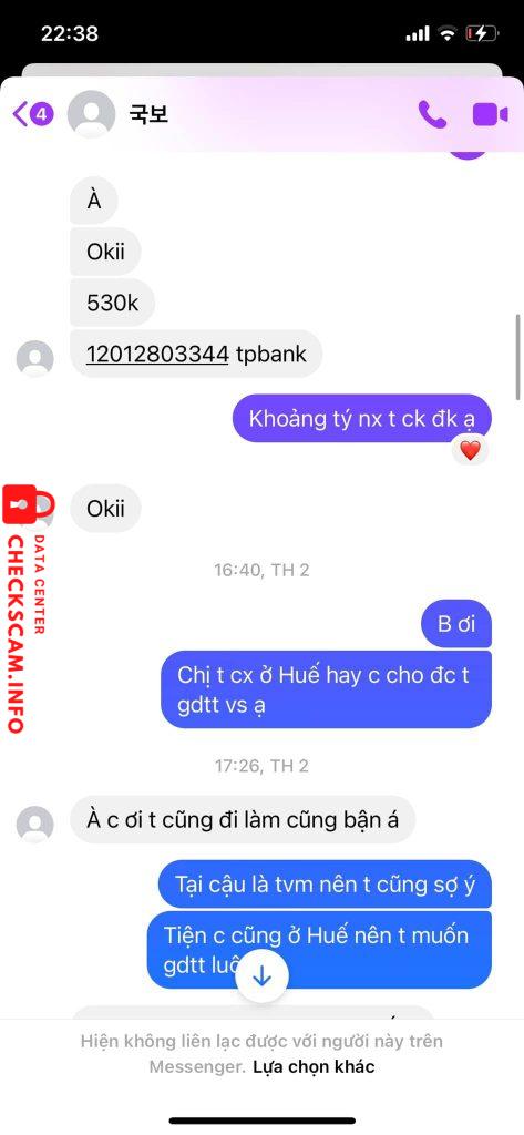 Cảnh báo kẻ lừa đảo: TRAN QUOC BAO Đã báo cáo: November 16, 2024 Thông tin kẻ lừa đảo Họ và tên: TRAN QUOC BAO Cổng thanh toán: TP Bank Tài khoản thanh toán: 12012803344 Danh mục: Lừa đảo mua bán Nguồn: Checkscam Tệp bằng chứng Mô tả báo cáo có dấu hiệu lừa đảo nhiều lần bằng nhiều account khác nhau Bình luận Bình luận của bạn Thêm bình luận Chưa có bình luận nào. Hãy là người đầu tiên chia sẻ kinh nghiệm của bạn với kẻ lừa đảo này.