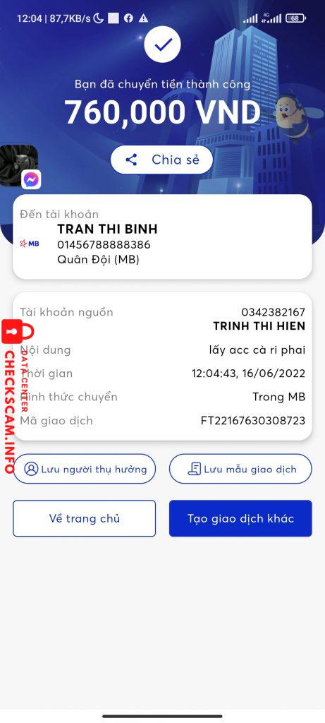 Cảnh báo kẻ lừa đảo: tran thanh binh Đã báo cáo: November 16, 2024 Thông tin kẻ lừa đảo Họ và tên: tran thanh binh Cổng thanh toán: mb Tài khoản thanh toán: 01456788888386 Danh mục: Lừa đảo mua bán Nguồn: Checkscam Tệp bằng chứng Mô tả báo cáo Bình luận Bình luận của bạn Thêm bình luận Chưa có bình luận nào. Hãy là người đầu tiên chia sẻ kinh nghiệm của bạn với kẻ lừa đảo này.