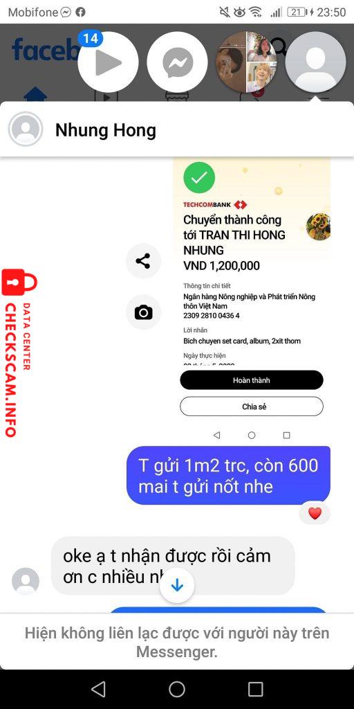 Cảnh báo kẻ lừa đảo: Tran Thi Hong Nhung Đã báo cáo: November 16, 2024 Thông tin kẻ lừa đảo Họ và tên: Tran Thi Hong Nhung Cổng thanh toán: Agribank Tài khoản thanh toán: 2309281004364 Danh mục: Lừa đảo mua bán Nguồn: Checkscam Tệp bằng chứng Mô tả báo cáo Người này đã từng có một tài khoản scam được báo cáo ở đây, đây là tài khoản thứ 2 và đã scam rất nhiều lần Bình luận Bình luận của bạn Thêm bình luận Chưa có bình luận nào. Hãy là người đầu tiên chia sẻ kinh nghiệm của bạn với kẻ lừa đảo này.