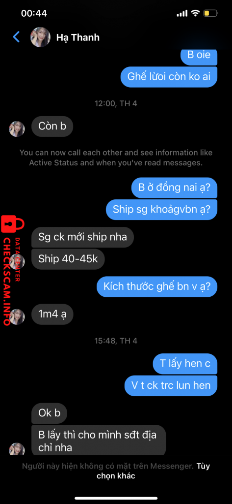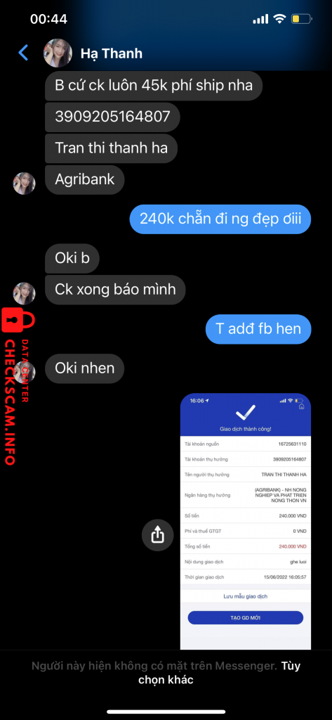 Cảnh báo kẻ lừa đảo: Tran thi thanh ha Đã báo cáo: November 16, 2024 Thông tin kẻ lừa đảo Họ và tên: Tran thi thanh ha Cổng thanh toán: Agribank Tài khoản thanh toán: 3909205164807 Danh mục: Lừa đảo mua bán Nguồn: Checkscam Tệp bằng chứng Mô tả báo cáo Kêu ck để mua ghế thanh lý, sau khi nhận tiền thì block , vẫn đăng tly trên các hội, có nhiều bạn cũbg bị gạt y chag Bình luận Bình luận của bạn Thêm bình luận Chưa có bình luận nào. Hãy là người đầu tiên chia sẻ kinh nghiệm của bạn với kẻ lừa đảo này.