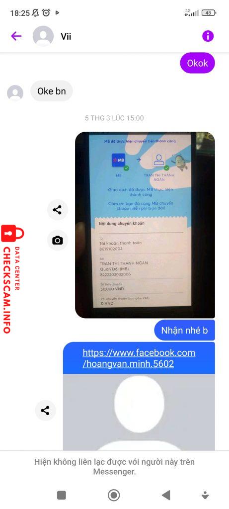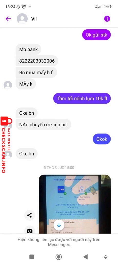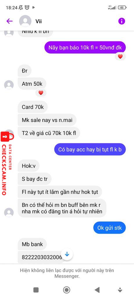 Cảnh báo kẻ lừa đảo: TRAN THI THANH NGAN Đã báo cáo: November 16, 2024 Thông tin kẻ lừa đảo Họ và tên: TRAN THI THANH NGAN Cổng thanh toán: MB BANK Tài khoản thanh toán: 8222203032006 Danh mục: Lừa đảo mua bán Nguồn: Checkscam Tệp bằng chứng Mô tả báo cáo Scam bán fl và acc ff Bình luận Bình luận của bạn Thêm bình luận Chưa có bình luận nào. Hãy là người đầu tiên chia sẻ kinh nghiệm của bạn với kẻ lừa đảo này.
