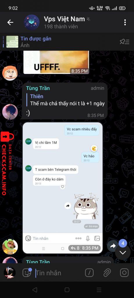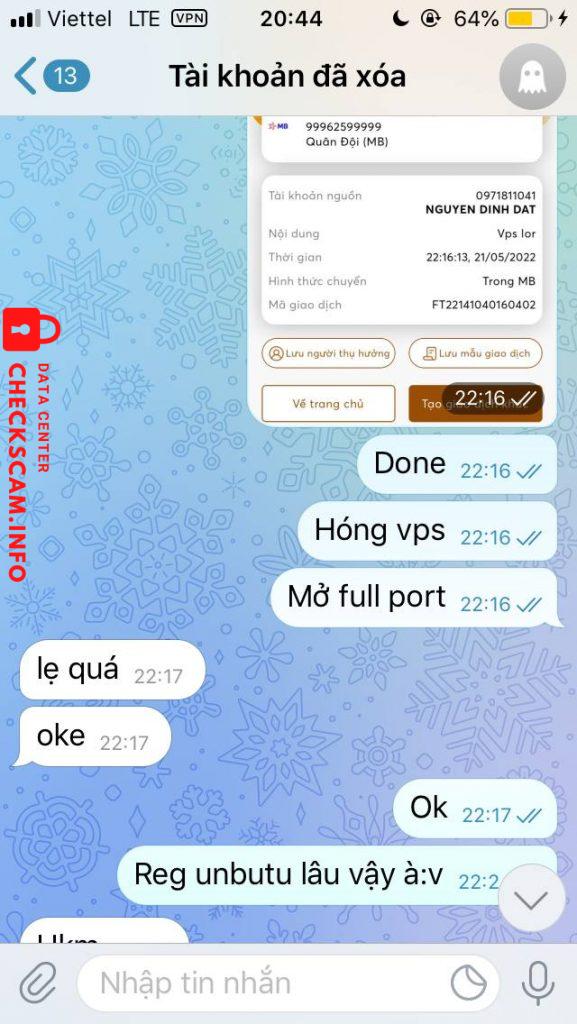 Scam 280k tôi + 25k của bạn tôi luôn scam 4con vps lừa đảo bảo hành vps chạy đc 3ngày xong lặn luôn xóa telegram ( còn ảnh kia là chứng cứ thằng bạn nó hỏi sao xóa telegram và nó chính là thằng scam chứng cứ cụ thể mong admin xem sét !!