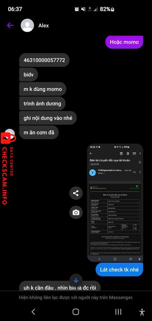 Cảnh báo kẻ lừa đảo: TRINH ANH DUONG Đã báo cáo: November 16, 2024 Thông tin kẻ lừa đảo Họ và tên: TRINH ANH DUONG Cổng thanh toán: Bidv Tài khoản thanh toán: 46310000057772 Danh mục: Lừa đảo mua bán Nguồn: Checkscam Tệp bằng chứng Mô tả báo cáo Đã bị chặn Bình luận Bình luận của bạn Thêm bình luận Chưa có bình luận nào. Hãy là người đầu tiên chia sẻ kinh nghiệm của bạn với kẻ lừa đảo này.