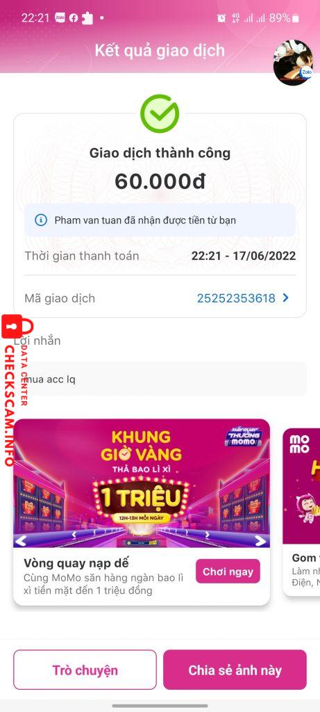 Cảnh báo kẻ lừa đảo: Tuấn Phạm Đã báo cáo: November 16, 2024 Thông tin kẻ lừa đảo Họ và tên: Tuấn Phạm Số điện thoại: 0382042091 Cổng thanh toán: Momo Tài khoản thanh toán: 0382042091 Danh mục: Lừa đảo mua bán Nguồn: Checkscam Tệp bằng chứng Mô tả báo cáo ck tiền xong block Bình luận Bình luận của bạn Thêm bình luận Chưa có bình luận nào. Hãy là người đầu tiên chia sẻ kinh nghiệm của bạn với kẻ lừa đảo này.