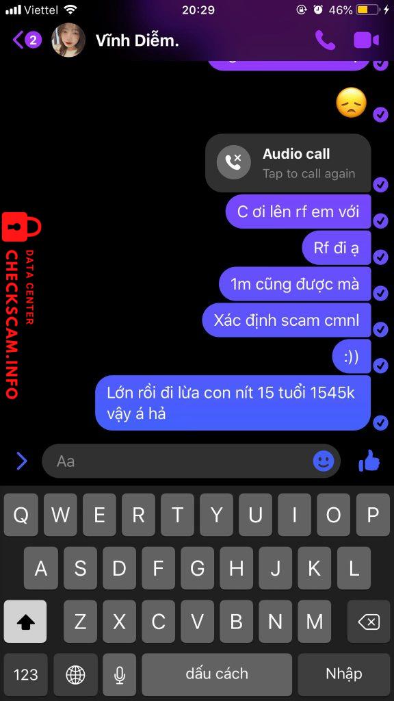 Cảnh báo kẻ lừa đảo: Vĩnh Diễm Đã báo cáo: November 16, 2024 Thông tin kẻ lừa đảo Họ và tên: Vĩnh Diễm Số điện thoại: 0327684182 Cổng thanh toán: MB Tài khoản thanh toán: 0327684182 Danh mục: Lừa đảo mua bán Nguồn: Checkscam Tệp bằng chứng Mô tả báo cáo lừa đảo tiền trên 3 triệu đồng Bình luận Bình luận của bạn Thêm bình luận Chưa có bình luận nào. Hãy là người đầu tiên chia sẻ kinh nghiệm của bạn với kẻ lừa đảo này.