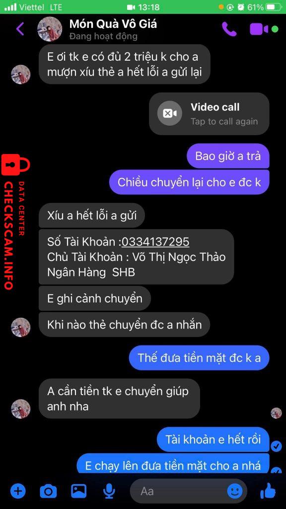 Cảnh báo kẻ lừa đảo: Võ Thị Ngọc Thảo Đã báo cáo: November 16, 2024 Thông tin kẻ lừa đảo Họ và tên: Võ Thị Ngọc Thảo Cổng thanh toán: SHB Tài khoản thanh toán: 0334137295 Danh mục: Lừa đảo mua bán Nguồn: Checkscam Tệp bằng chứng Mô tả báo cáo Lừa đảo, hack zalo lạm dụng uy tín lừa đảo tiền người khác, mạo danh thân phận Bình luận Bình luận của bạn Thêm bình luận Chưa có bình luận nào. Hãy là người đầu tiên chia sẻ kinh nghiệm của bạn với kẻ lừa đảo này.