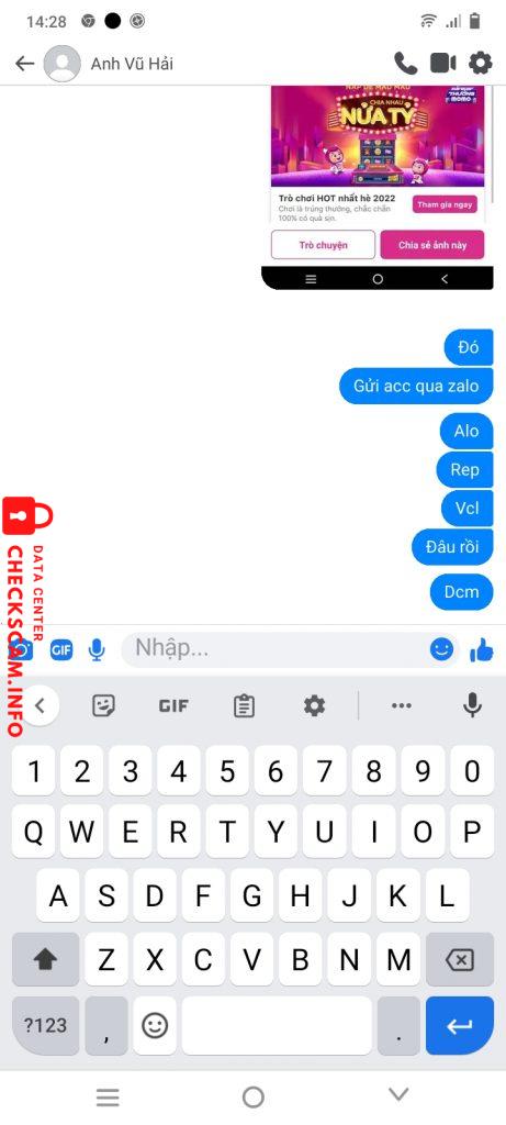 Cảnh báo kẻ lừa đảo: Vũ hai Anh Đã báo cáo: November 16, 2024 Thông tin kẻ lừa đảo Họ và tên: Vũ hai Anh Số điện thoại: 0354113127 Cổng thanh toán: Momo Tài khoản thanh toán: 0354113127 Danh mục: Lừa đảo mua bán Nguồn: Checkscam Tệp bằng chứng Mô tả báo cáo Scam acc fb 800 Bình luận Bình luận của bạn Thêm bình luận Chưa có bình luận nào. Hãy là người đầu tiên chia sẻ kinh nghiệm của bạn với kẻ lừa đảo này.