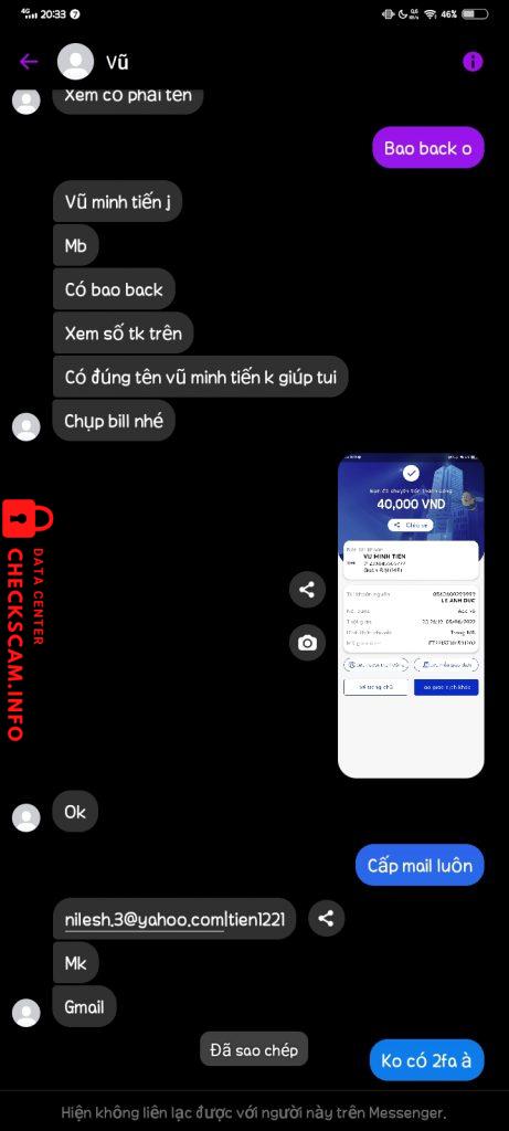 Cảnh báo kẻ lừa đảo: Vũ Minh Tiến Đã báo cáo: November 16, 2024 Thông tin kẻ lừa đảo Họ và tên: Vũ Minh Tiến Cổng thanh toán: MB BANK Tài khoản thanh toán: 01233445566777 Danh mục: Lừa đảo mua bán Nguồn: Checkscam Tệp bằng chứng Mô tả báo cáo Scam bán fb cổ Bình luận Bình luận của bạn Thêm bình luận Chưa có bình luận nào. Hãy là người đầu tiên chia sẻ kinh nghiệm của bạn với kẻ lừa đảo này.