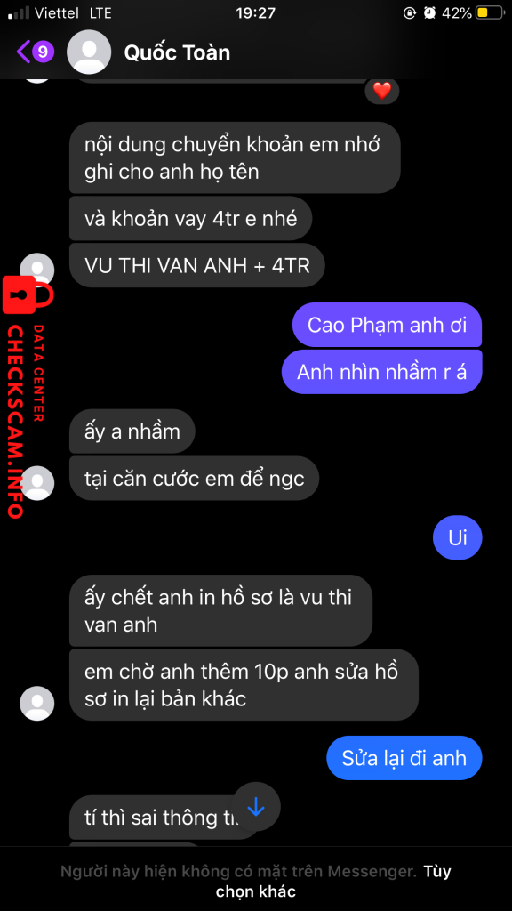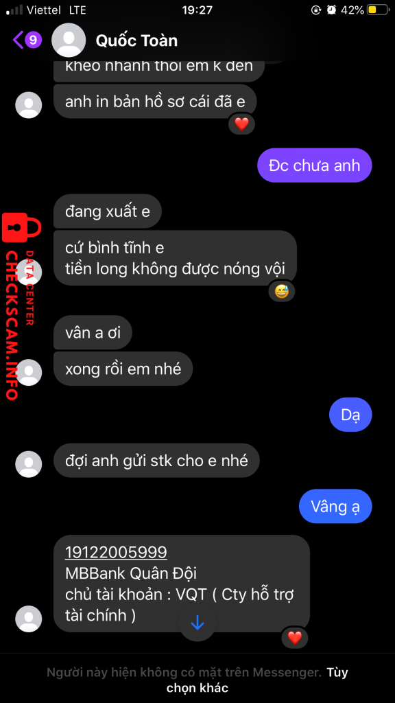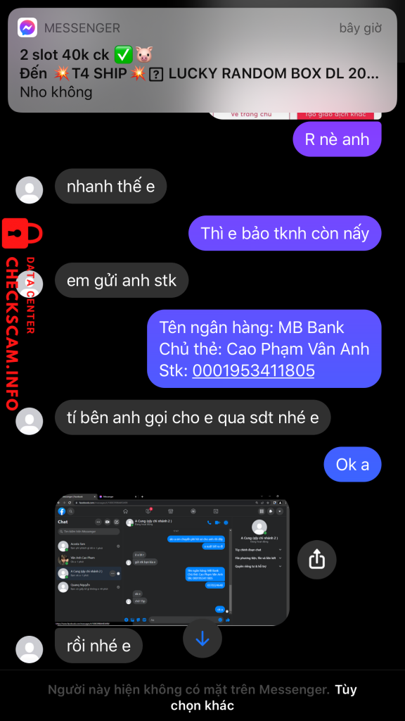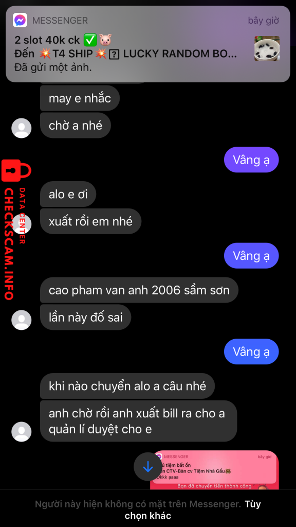 Cảnh báo kẻ lừa đảo: VỤ QUOC TOAN Đã báo cáo: November 16, 2024 Thông tin kẻ lừa đảo Họ và tên: VỤ QUOC TOAN Cổng thanh toán: MB Bank Tài khoản thanh toán: 19122005999 Danh mục: Lừa đảo mua bán Nguồn: Checkscam Tệp bằng chứng Mô tả báo cáo Lừa đảo nên cẩn thận Bình luận Bình luận của bạn Thêm bình luận Chưa có bình luận nào. Hãy là người đầu tiên chia sẻ kinh nghiệm của bạn với kẻ lừa đảo này.